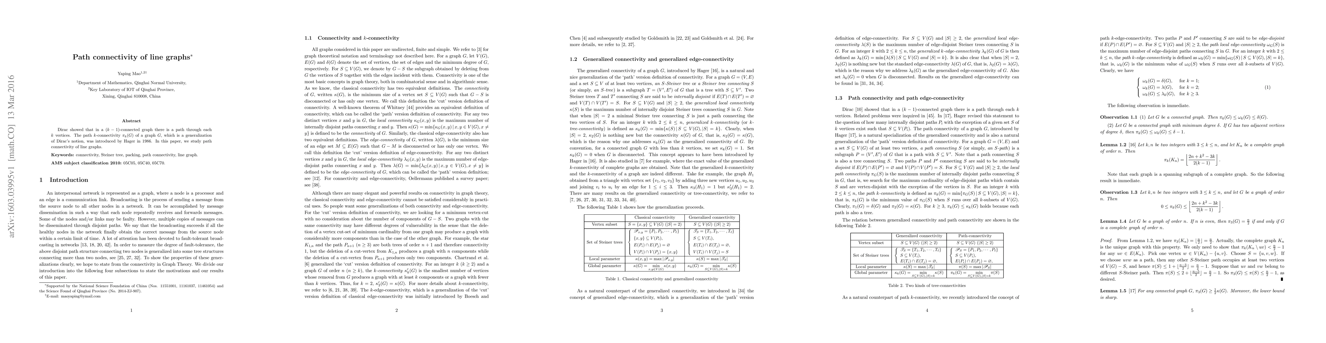 Researchers studied path connectivity in line graphs, a concept related to graph connectivity that generalizes Dirac's notion of $k$-connectivity. They aimed to understand the path $k$-connectivity $ au_k(G)$ of line graphs.