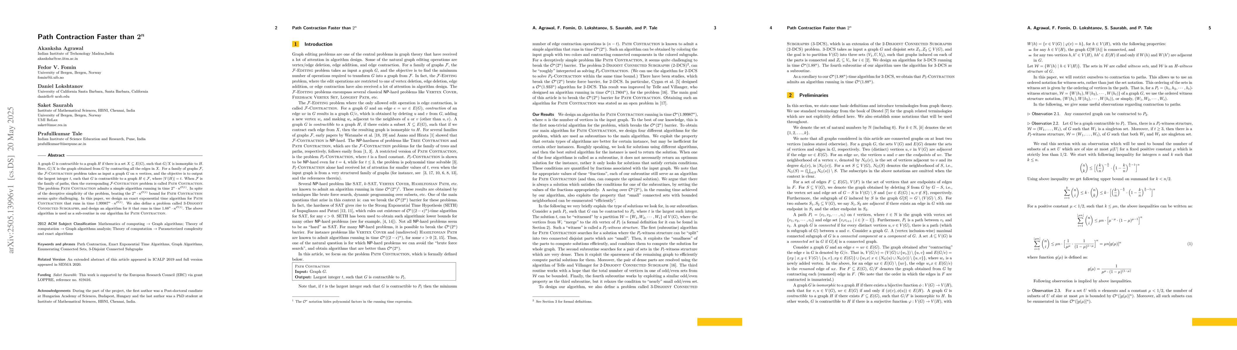 The paper presents an exact exponential time algorithm for Path Contraction, utilizing a sub-routine for the 3-Disjoint Connected Subgraphs problem.