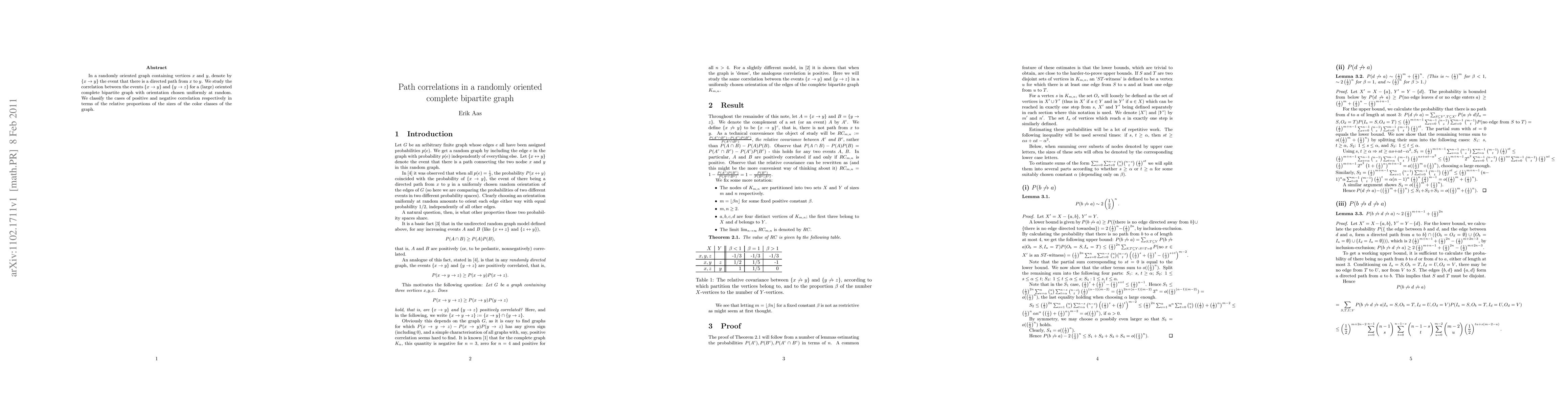 This paper studies the correlation between paths in a randomly oriented complete bipartite graph, focusing on the relationship between events of directed paths from one vertex to another and from that vertex to another. It classifies positive and negative correlations based on the relative sizes of color classes in the graph.