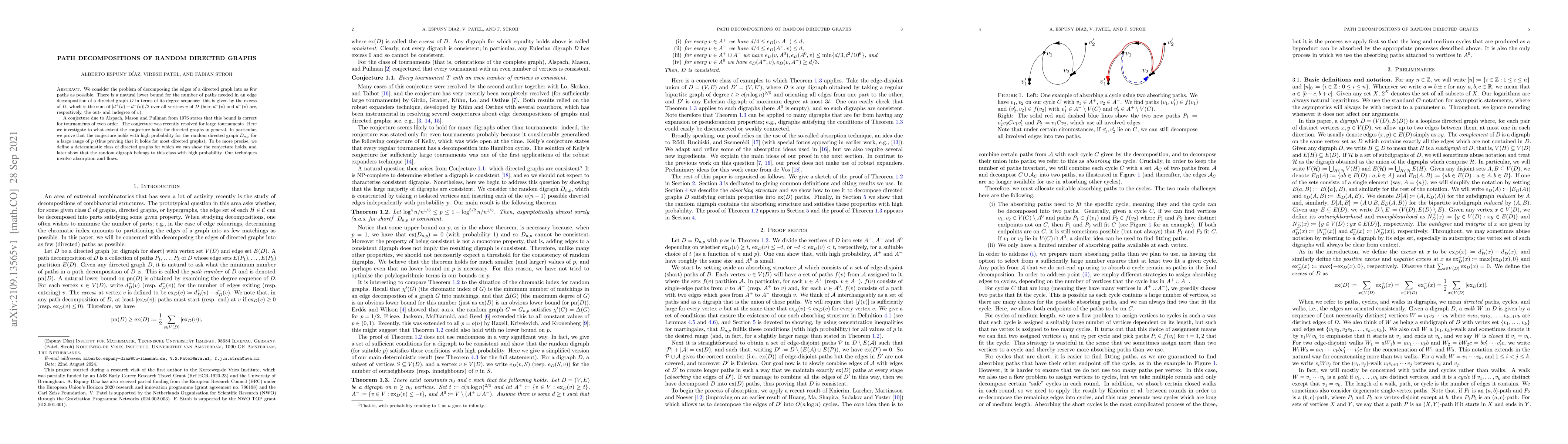 This paper investigates the conjecture by Alspach, Mason, and Pullman regarding the minimum number of paths needed to decompose the edges of a directed graph, proving that it holds with high probability for the random directed graph $D_{n,p}$ over a large range of $p$. The authors demonstrate that the random digraph falls into a deterministic class where the conjecture is valid.