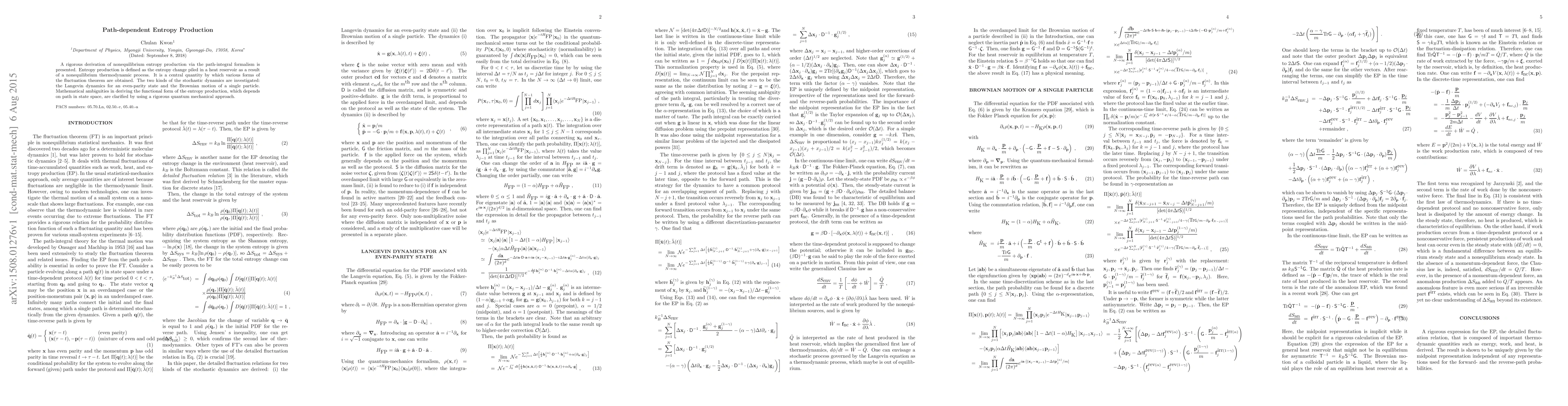 A rigorous derivation of nonequilibrium entropy production via the path-integral formalism is presented. Entropy production is defined as the entropy change piled in a heat reservoir as a result of a nonequilibrium thermodynamic process. It is a central quantity by which various forms of the fluctuation theorem are obtained. The two kinds of the stochastic dynamics are investigated: the Langevin dynamics for an even-parity state and the Brownian motion of a single particle. Mathematical ambiguities in deriving the functional form of the entropy production, which depends on path in state space, are clarified by using a rigorous quantum mechanical approach.