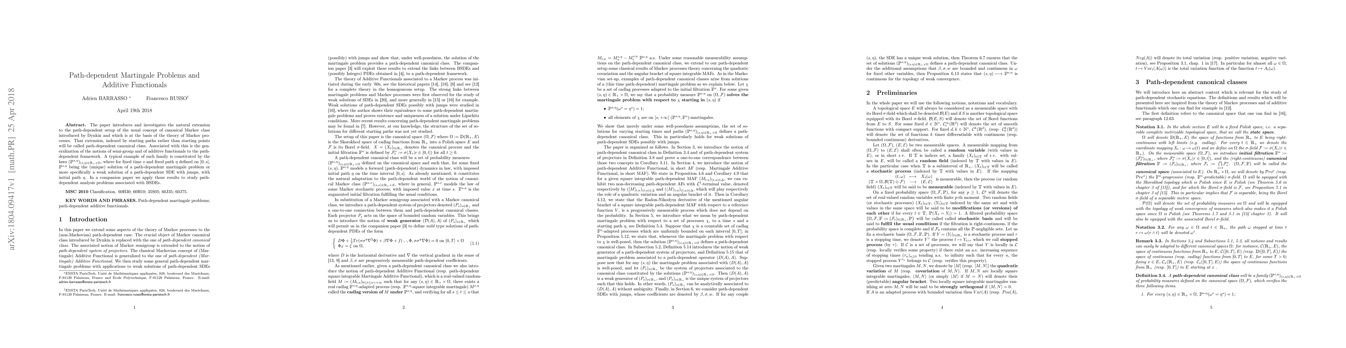 The paper introduces and investigates the natural extension to the path-dependent setup of the usual concept of canonical Markov class introduced by Dynkin and which is at the basis of the theory of Markov processes. That extension, indexed by starting paths rather than starting points will be called path-dependent canonical class. Associated with this is the generalization of the notions of semi-group and of additive functionals to the path-dependent framework. A typical example of such family is constituted by the laws $({\mathbb P}^{s,$\eta$})\_{(s,\eta) \in{\mathbb R} \times \Omega}$ , where for fixed time s and fixed path $\eta$ defined on [0, s], $({\mathbb P}^{s,$\eta$})\_{(s,\eta) \in {\mathbb R} \times \Omega}$ being the (unique) solution of a path-dependent martingale problem or more specifically a weak solution of a path-dependent SDE with jumps, with initial path $\eta$. In a companion paper we apply those results to study path-dependent analysis problems associated with BSDEs.