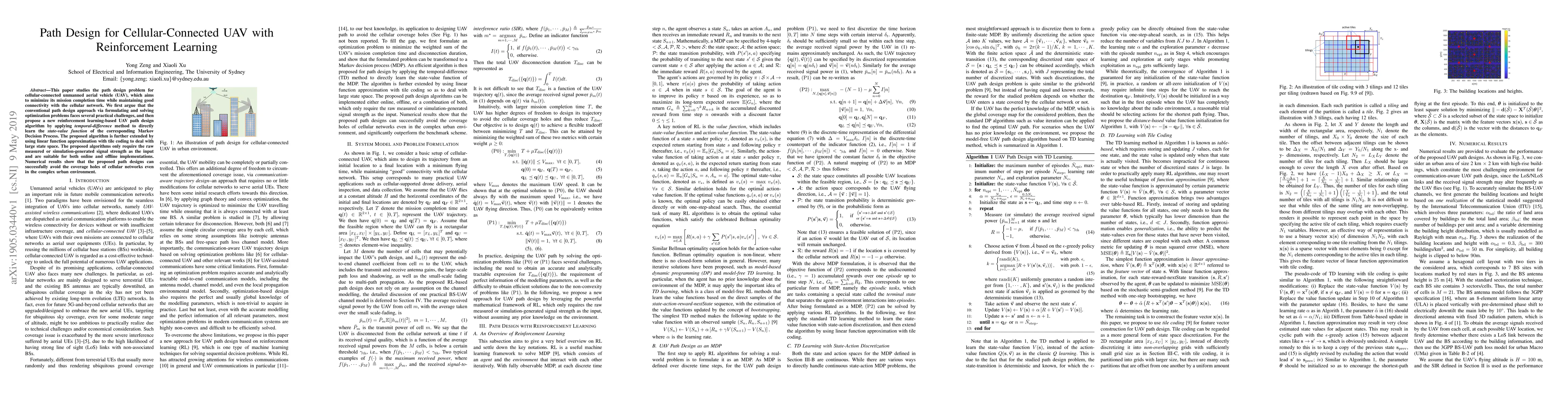 This paper proposes a reinforcement learning-based algorithm for cellular-connected UAV path design to minimize mission time while maintaining network connectivity. The algorithm uses temporal-difference methods to learn the state-value function, extended with linear function approximation for scalability, and demonstrates successful avoidance of cellular network coverage holes in urban environments.