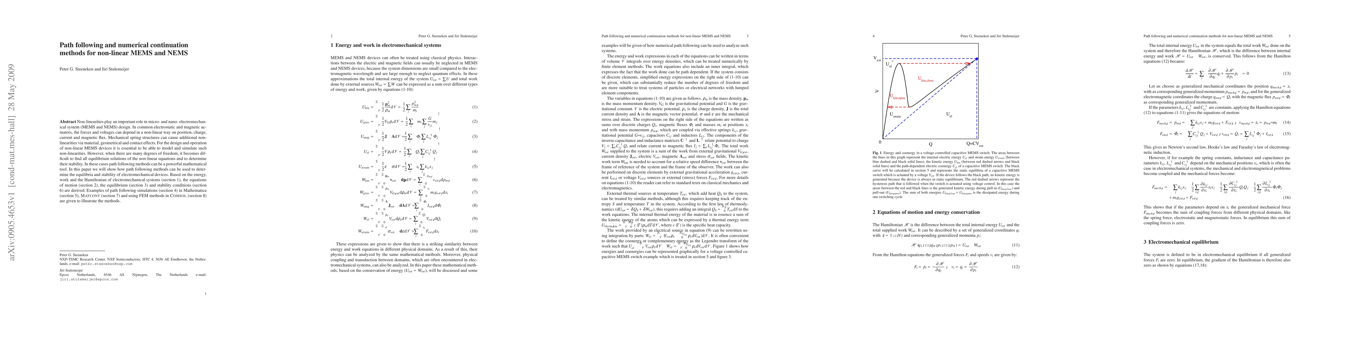 Non-linearities play an important role in micro- and nano- electromechanical system (MEMS and NEMS) design. In common electrostatic and magnetic actuators, the forces and voltages can depend in a non-linear way on position, charge, current and magnetic flux. Mechanical spring structures can cause additional non-linearities via material, geometrical and contact effects. For the design and operation of non-linear MEMS devices it is essential to be able to model and simulate such non-linearities. However, when there are many degrees of freedom, it becomes difficult to find all equilibrium solutions of the non-linear equations and to determine their stability. In these cases path following methods can be a powerful mathematical tool. In this paper we will show how path following methods can be used to determine the equilibria and stability of electromechanical devices. Based on the energy, work and the Hamiltonian of electromechanical systems (section 1), the equations of motion (section 2), the equilibrium (section 3) and stability conditions (section 6) are derived. Examples of path following simulations (section 4) in Mathematica (section 5), Matcont (section 7) and using FEM methods in Comsol (section 8) are given to illustrate the methods.