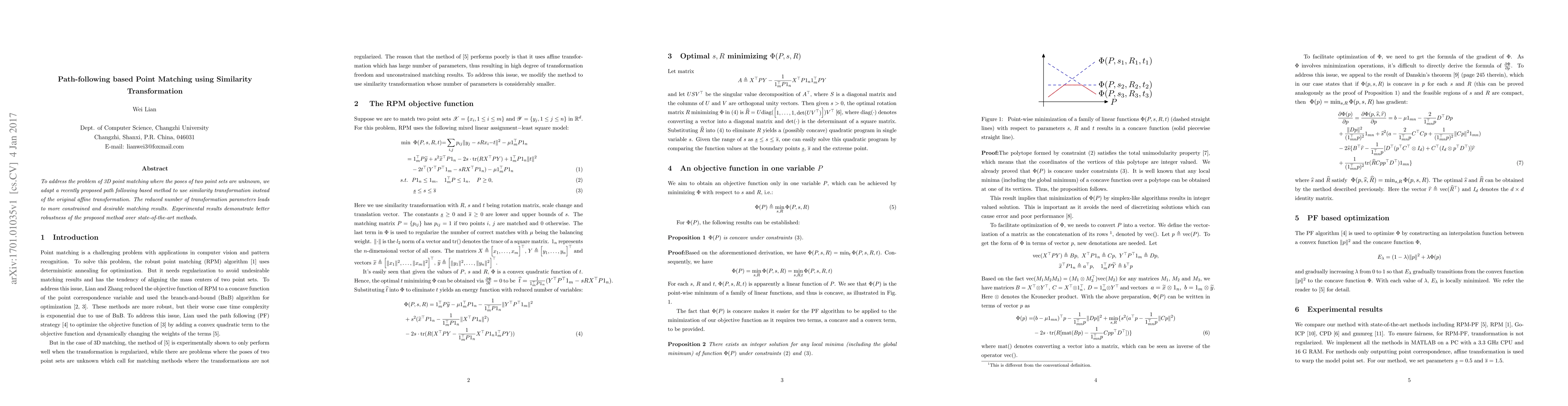 To address the problem of 3D point matching where the poses of two point sets are unknown, we adapt a recently proposed path following based method to use similarity transformation instead of the original affine transformation. The reduced number of transformation parameters leads to more constrained and desirable matching results. Experimental results demonstrate better robustness of the proposed method over state-of-the-art methods.