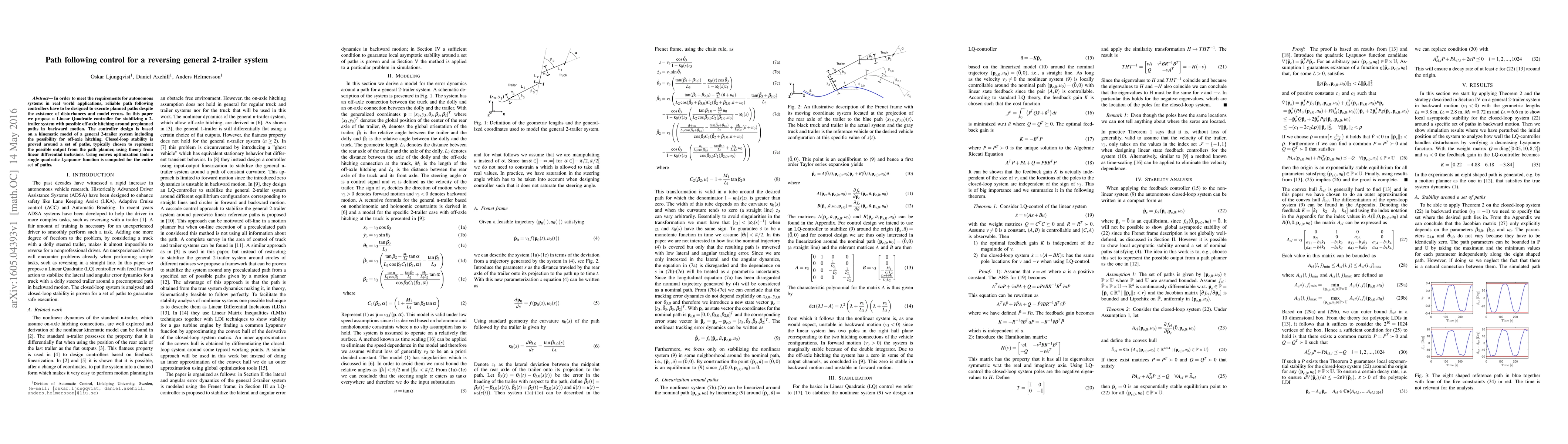 This paper proposes a Linear Quadratic controller for stabilizing a 2-trailer system to follow preplanned paths in reverse motion, accounting for disturbances and model errors. Stability is proven using linear differential inclusions and convex optimization for a single quadratic Lyapunov function.
