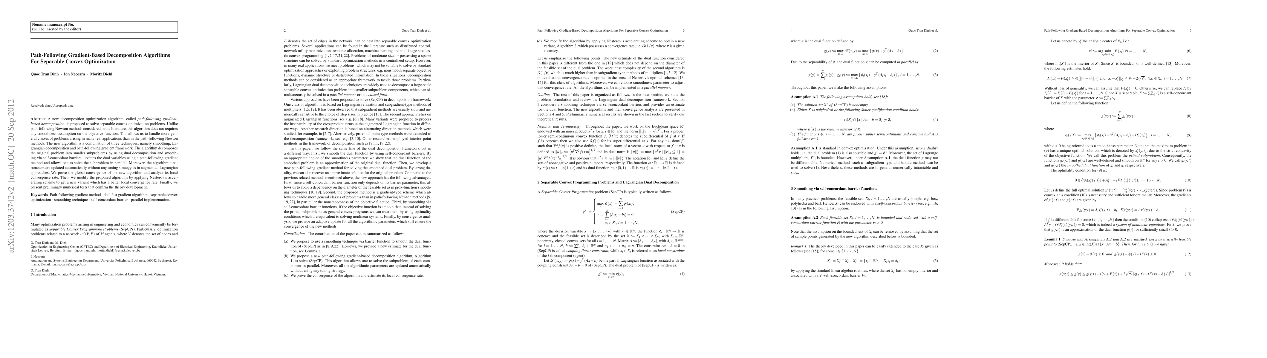 A new decomposition optimization algorithm, called \textit{path-following gradient-based decomposition}, is proposed to solve separable convex optimization problems. Unlike path-following Newton methods considered in the literature, this algorithm does not requires any smoothness assumption on the objective function. This allows us to handle more general classes of problems arising in many real applications than in the path-following Newton methods. The new algorithm is a combination of three techniques, namely smoothing, Lagrangian decomposition and path-following gradient framework. The algorithm decomposes the original problem into smaller subproblems by using dual decomposition and smoothing via self-concordant barriers, updates the dual variables using a path-following gradient method and allows one to solve the subproblem in parallel. Moreover, the algorithmic parameters are updated automatically without any tuning strategy as in augmented Lagrangian approaches. We prove the global convergence of the new algorithm and analyze its local convergence rate. Then, we modify the proposed algorithm by applying Nesterov's accelerating scheme to get a new variant which has a better local convergence rate. Finally, we present preliminary numerical tests that confirm the theory development.