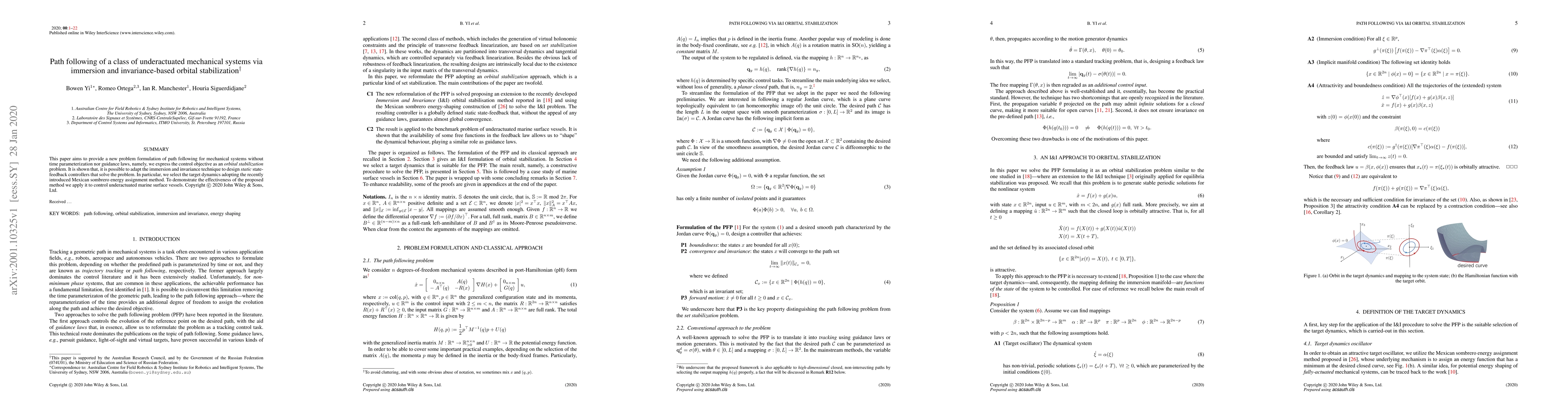 This paper aims to provide a new problem formulation of path following for mechanical systems without time parameterization nor guidance laws, namely, we express the control objective as an orbital stabilization problem. It is shown that, it is possible to adapt the immersion and invariance technique to design static state-feedback controllers that solve the problem. In particular, we select the target dynamics adopting the recently introduced Mexican sombrero energy assignment method. To demonstrate the effectiveness of the proposed method we apply it to control underactuated marine surface vessels.