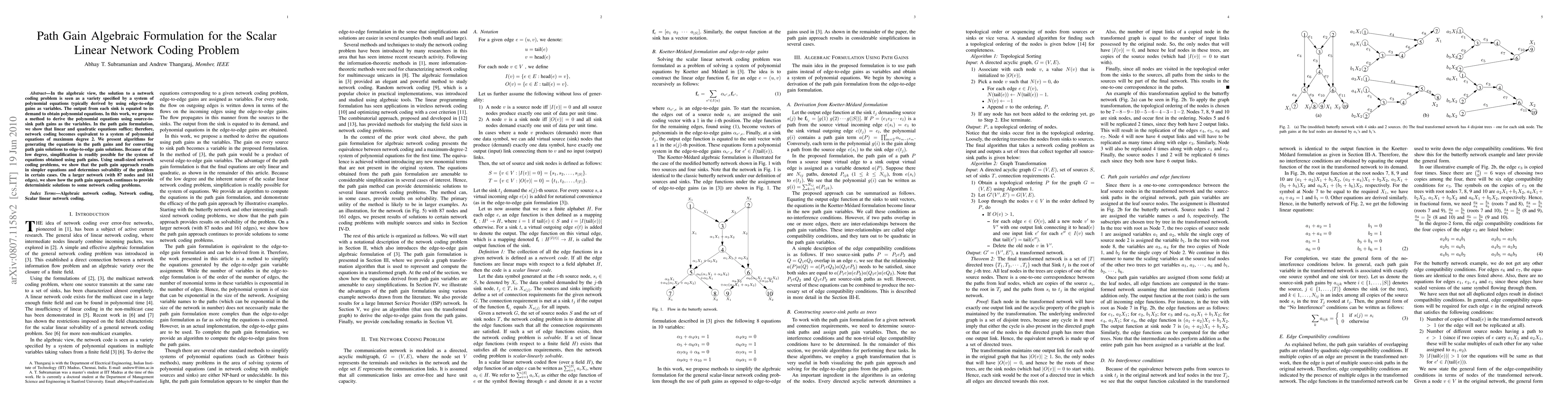 In the algebraic view, the solution to a network coding problem is seen as a variety specified by a system of polynomial equations typically derived by using edge-to-edge gains as variables. The output from each sink is equated to its demand to obtain polynomial equations. In this work, we propose a method to derive the polynomial equations using source-to-sink path gains as the variables. In the path gain formulation, we show that linear and quadratic equations suffice; therefore, network coding becomes equivalent to a system of polynomial equations of maximum degree 2. We present algorithms for generating the equations in the path gains and for converting path gain solutions to edge-to-edge gain solutions. Because of the low degree, simplification is readily possible for the system of equations obtained using path gains. Using small-sized network coding problems, we show that the path gain approach results in simpler equations and determines solvability of the problem in certain cases. On a larger network (with 87 nodes and 161 edges), we show how the path gain approach continues to provide deterministic solutions to some network coding problems.