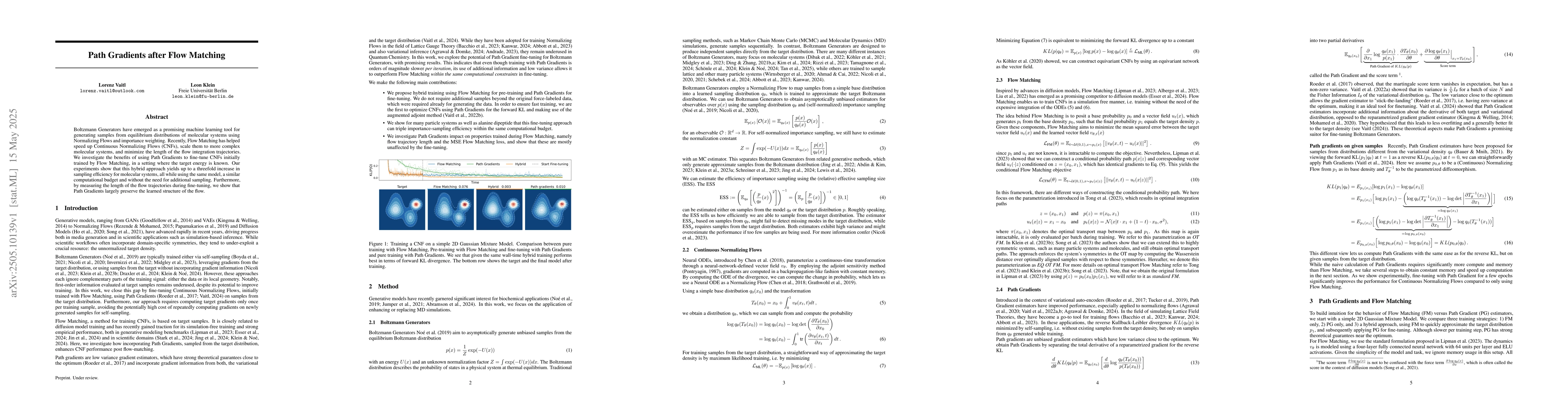 Boltzmann Generators have emerged as a promising machine learning tool for generating samples from equilibrium distributions of molecular systems using Normalizing Flows and importance weighting. Recently, Flow Matching has helped speed up Continuous Normalizing Flows (CNFs), scale them to more complex molecular systems, and minimize the length of the flow integration trajectories. We investigate the benefits of using path gradients to fine-tune CNFs initially trained by Flow Matching, in the setting where a target energy is known. Our experiments show that this hybrid approach yields up to a threefold increase in sampling efficiency for molecular systems, all while using the same model, a similar computational budget and without the need for additional sampling. Furthermore, by measuring the length of the flow trajectories during fine-tuning, we show that path gradients largely preserve the learned structure of the flow.
