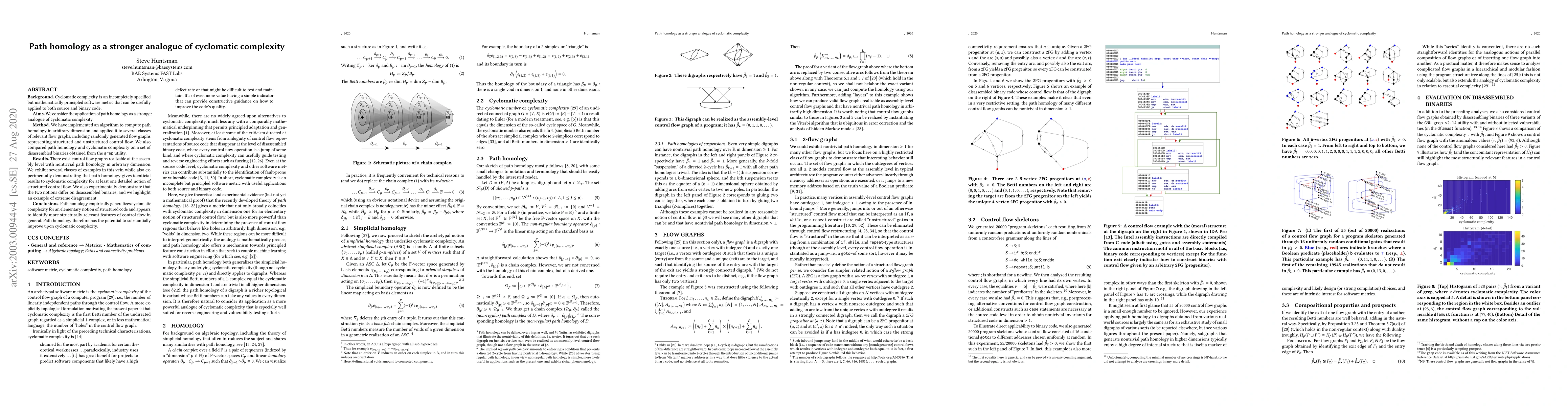 The paper introduces path homology as a more robust alternative to cyclomatic complexity, a software metric. Through algorithms and experiments on flow graphs and disassembled binaries, it demonstrates that path homology captures more structural control flow features, potentially enhancing cyclomatic complexity.