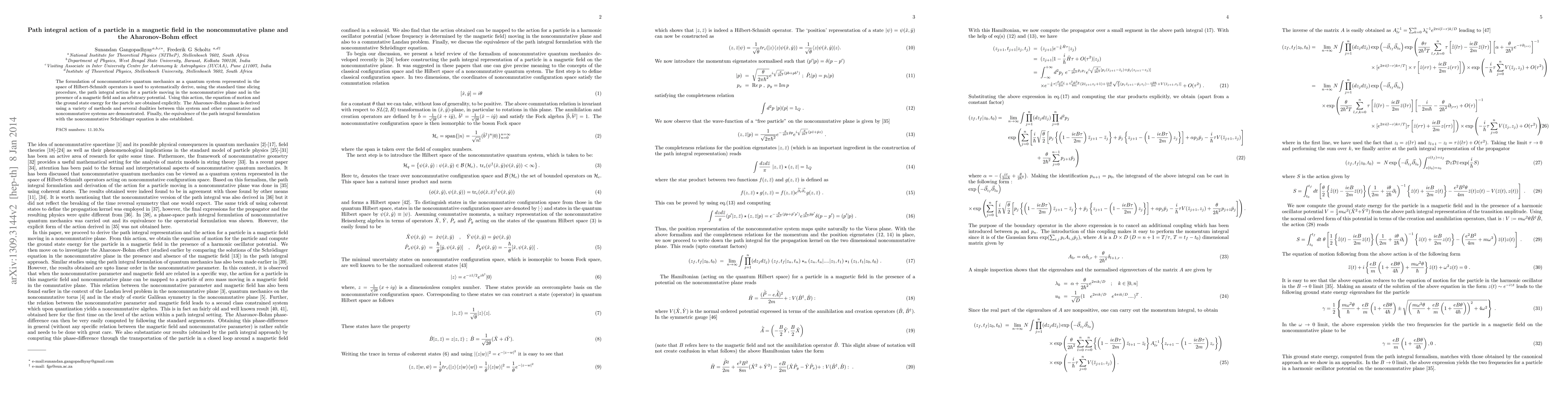 This paper derives the path integral action for a particle in a noncommutative plane with a magnetic field and arbitrary potential, establishing the equation of motion and ground state energy. The Aharonov-Bohm phase is derived, and dualities with commutative systems are demonstrated, confirming the equivalence with the noncommutative Schrödinger equation.