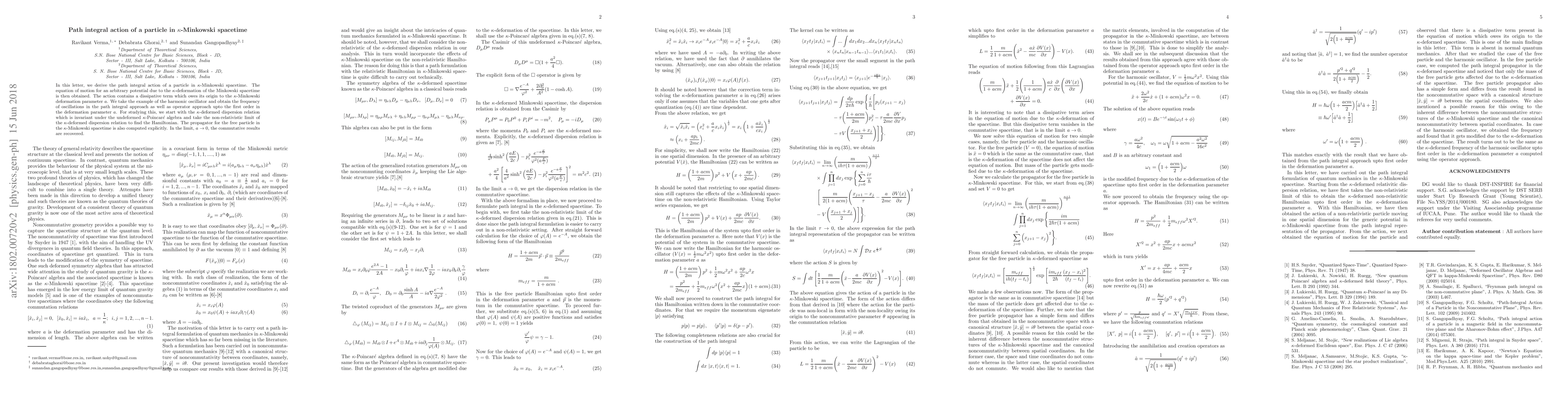 In this letter, we derive the path integral action of a particle in $\kappa$-Minkowski spacetime. The equation of motion for an arbitrary potential due to the $\kappa$-deformation of the Minkowski spacetime is then obtained. The action contains a dissipative term which owes its origin to the $\kappa$-Minkowski deformation parameter $a$. We take the example of the harmonic oscillator and obtain the frequency of oscillations in the path integral approach as well as operator approach upto the first order in the deformation parameter $a$. For studying this, we start with the $\kappa$-deformed dispersion relation which is invariant under the undeformed $\kappa$-Poincar$\acute{e}$ algebra and take the non-relativistic limit of the $\kappa$-deformed dispersion relation to find the Hamiltonian. The propagator for the free particle in the $\kappa$-Minkowski spacetime is also computed explicitly. In the limit, $a\rightarrow 0$, the commutative results are recovered.