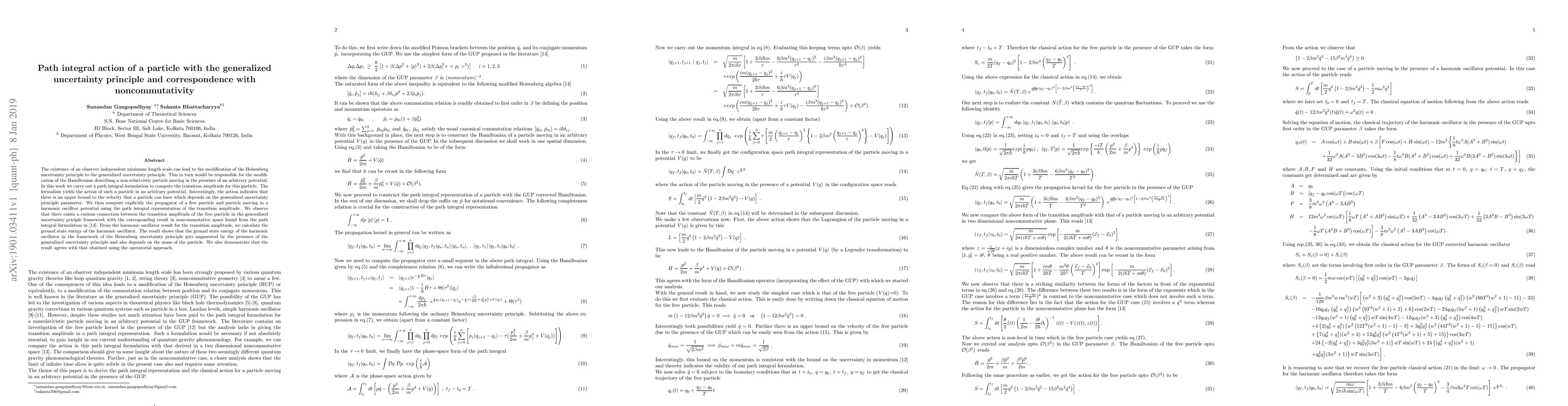 This paper explores the path integral formulation of a particle under the generalized uncertainty principle, revealing an upper bound on particle velocity dependent on the principle's parameter. It finds a surprising correspondence between the transition amplitude in this framework and that in noncommutative space, and shows the ground state energy of a harmonic oscillator is augmented by the generalized uncertainty principle.