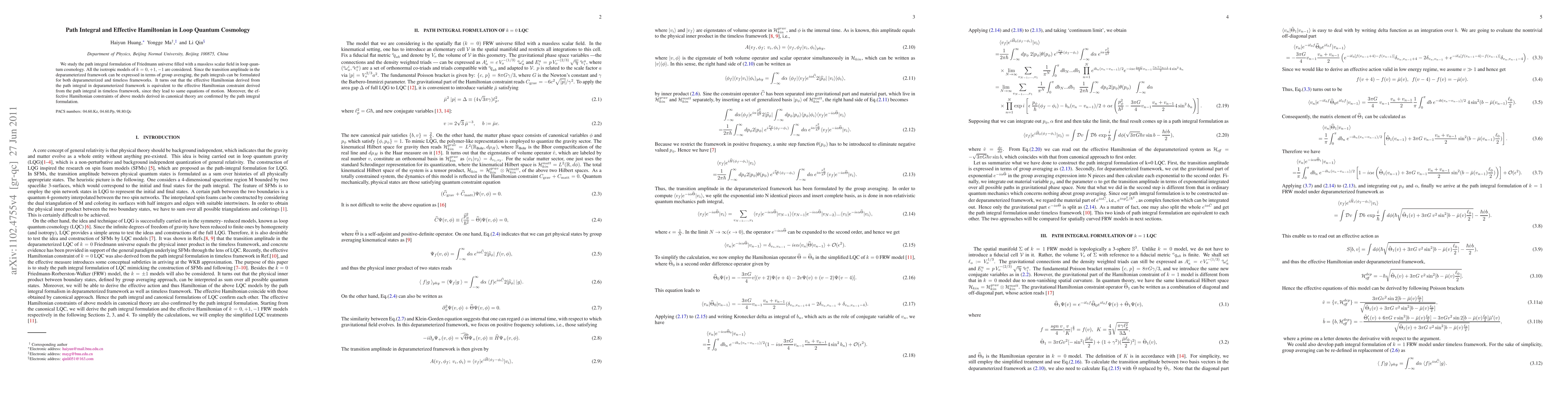 This paper explores the path integral formulation in loop quantum cosmology for Friedmann universes with a massless scalar field, considering $k=0,+1,-1$ models. It proposes a group-averaging method for constructing path integrals in both deparameterized and timeless frameworks, demonstrating their equivalence and confirming the consistency of effective Hamiltonian constraints derived from both approaches.