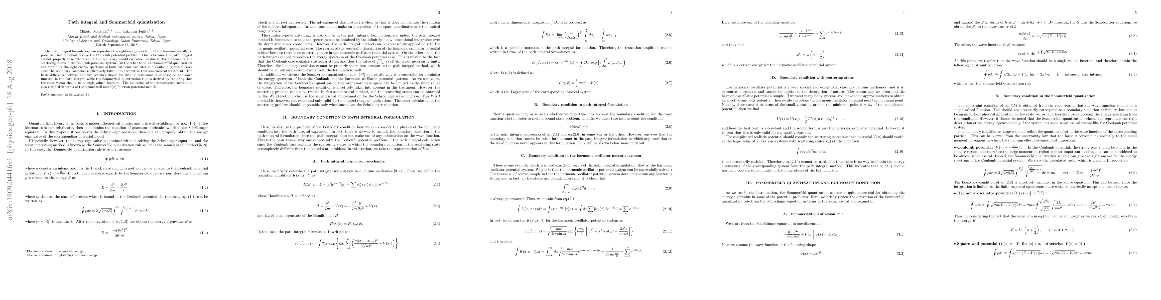 The path integral formulation and Sommerfeld quantization can both reproduce the energy spectrum of harmonic oscillators and Coulomb potentials, but with different approaches: path integral lacks boundary conditions, while Sommerfeld's method incorporates them.