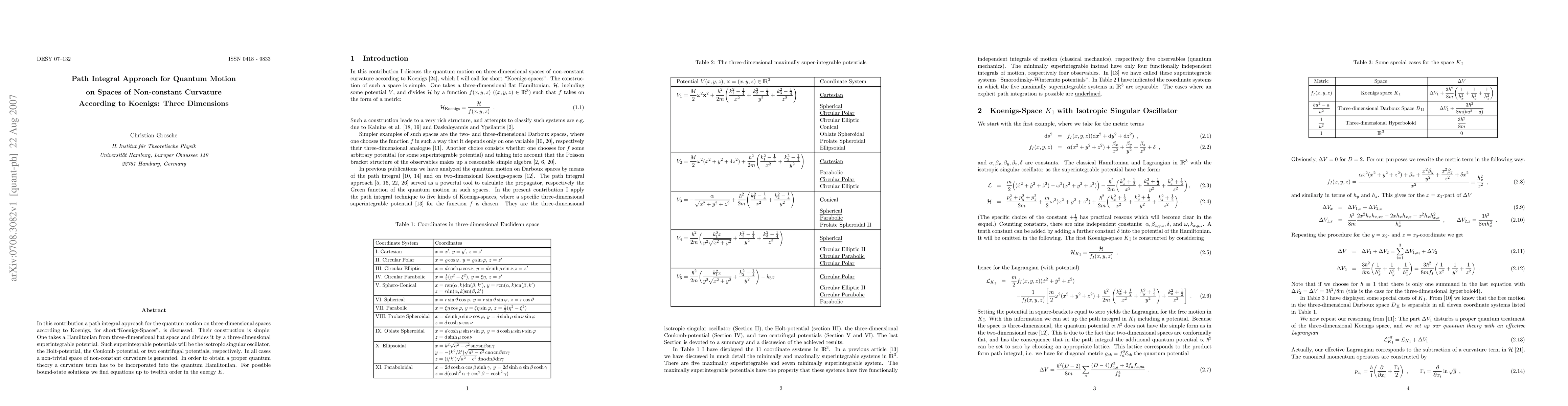 In this contribution a path integral approach for the quantum motion on three-dimensional spaces according to Koenigs, for short``Koenigs-Spaces'', is discussed. Their construction is simple: One takes a Hamiltonian from three-dimensional flat space and divides it by a three-dimensional superintegrable potential. Such superintegrable potentials will be the isotropic singular oscillator, the Holt-potential, the Coulomb potential, or two centrifugal potentials, respectively. In all cases a non-trivial space of non-constant curvature is generated. In order to obtain a proper quantum theory a curvature term has to be incorporated into the quantum Hamiltonian. For possible bound-state solutions we find equations up to twelfth order in the energy E.