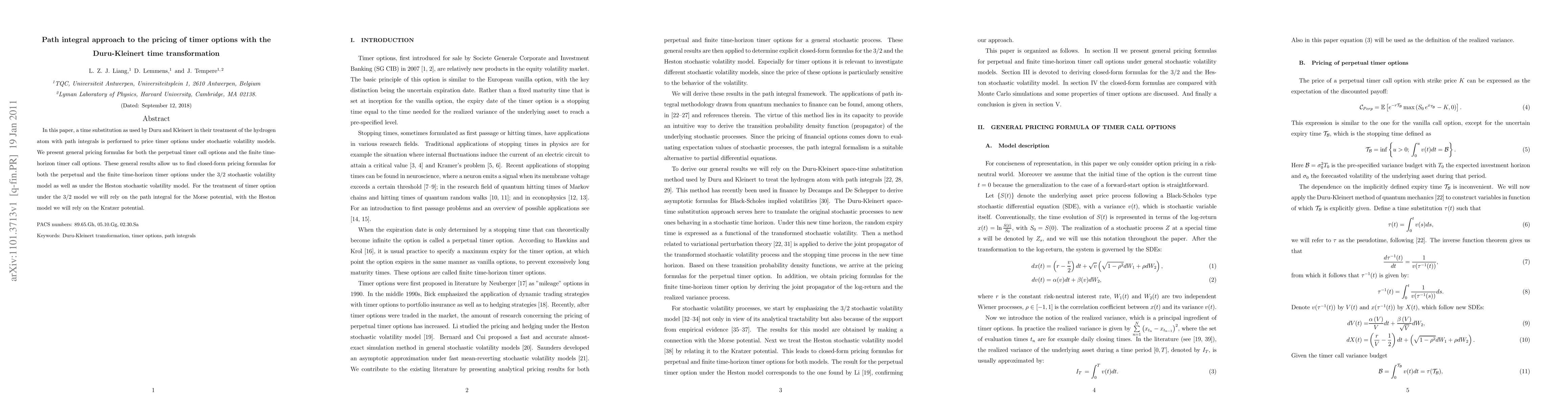 In this paper, a time substitution as used by Duru and Kleinert in their treatment of the hydrogen atom with path integrals is performed to price timer options under stochastic volatility models. We present general pricing formulas for both the perpetual timer call options and the finite time-horizon timer call options. These general results allow us to find closed-form pricing formulas for both the perpetual and the finite time-horizon timer options under the 3/2 stochastic volatility model as well as under the Heston stochastic volatility model. For the treatment of timer option under the 3/2 model we will rely on the path integral for the Morse potential, with the Heston model we will rely on the Kratzer potential.