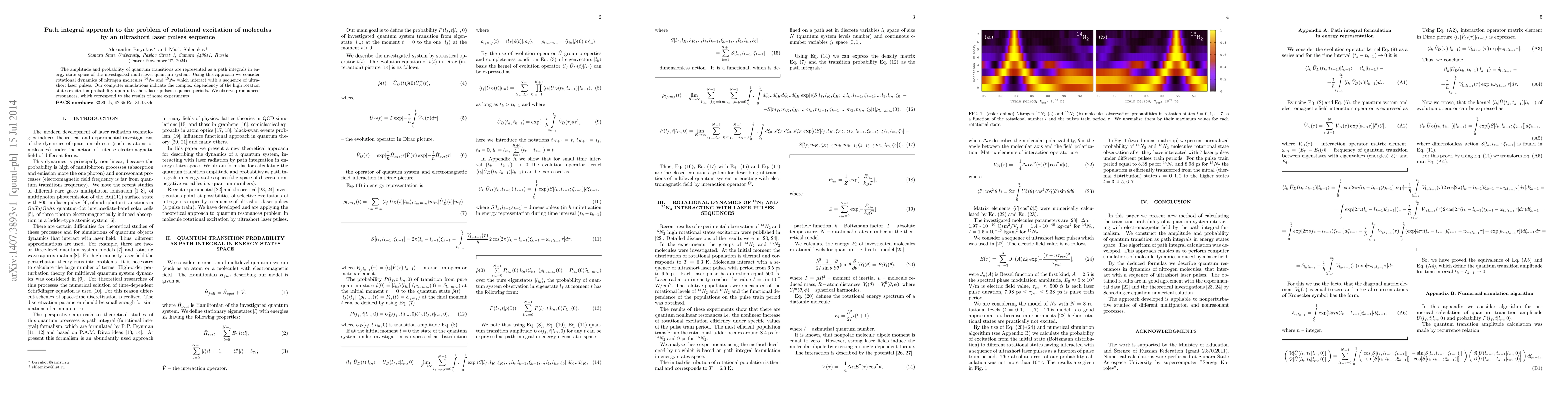 The amplitude and probability of quantum transitions are represented as a path integrals in energy state space of the investigated multi-level quantum system. Using this approach we consider rotational dynamics of nitrogen molecules $^{14}N_{2}$ and $^{15}N_{2}$ which interact with a sequence of ultrashort laser pulses. Our computer simulations indicate the complex dependency of the high rotation states excitation probability upon ultrashort laser pulses sequence periods. We observe pronounced resonances, which correspond to the results of some experiments.