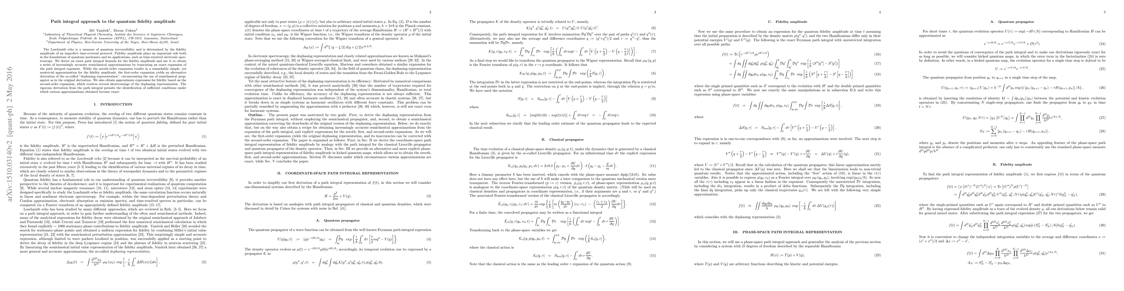 The Loschmidt echo is a measure of quantum irreversibility and is determined by the fidelity amplitude of an imperfect time-reversal protocol. Fidelity amplitude plays an important role both in the foundations of quantum mechanics and its applications, such as time-resolved electronic spectroscopy. We derive an exact path integral formula for the fidelity amplitude and use it to obtain a series of increasingly accurate semiclassical approximations by truncating an exact expansion of the path integral exponent. While the zeroth-order expansion results in a remarkably simple, yet nontrivial approximation for the fidelity amplitude, the first-order expansion yields an alternative derivation of the so-called "dephasing representation", circumventing the use of semiclassical propagator as in the original derivation. We also obtain approximate expression for fidelity based on the second-order expansion, which resolves several shortcomings of the dephasing representation. The rigorous derivation from the path integral permits the identification of sufficient conditions under which various approximations obtained become exact.