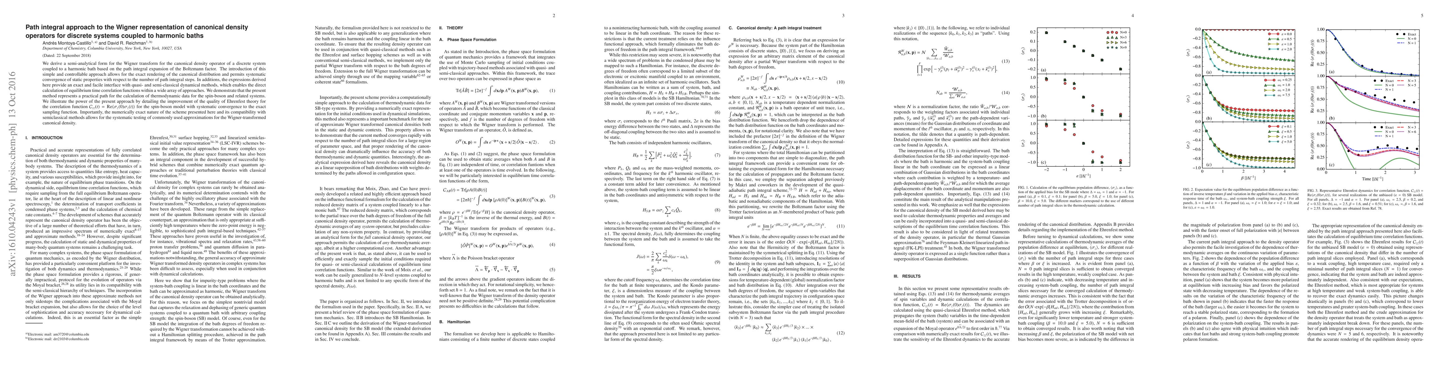 We derive a semi-analytical form for the Wigner transform for the canonical density operator of a discrete system coupled to a harmonic bath based on the path integral expansion of the Boltzmann factor. The introduction of this simple and controllable approach allows for the exact rendering of the canonical distribution and permits systematic convergence of static properties with respect to the number of path integral steps. In additions, the expressions derived here provide an exact and facile interface with quasi- and semi-classical dynamical methods, which enables the direct calculation of equilibrium time correlation functions within a wide array of approaches. We demonstrate that the present method represents a practical path for the calculation of thermodynamic data for the spin-boson and related systems. We illustrate the power of the present approach by detailing the improvement of the quality of Ehrenfest theory for the correlation function $\mathcal{C}_{zz}(t) = \mathrm{Re}\langle \sigma_z(0)\sigma_z(t)\rangle$ for the spin-boson model with systematic convergence to the exact sampling function. Importantly, the numerically exact nature of the scheme presented here and its compatibility with semiclassical methods allows for the systematic testing of commonly used approximations for the Wigner-transformed canonical density.