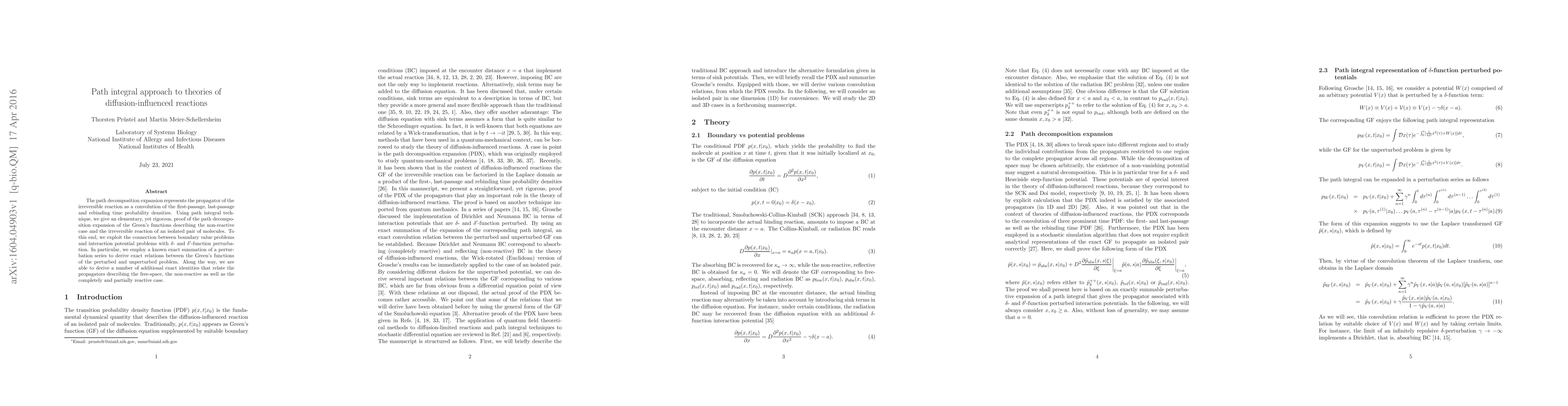 Researchers develop a new method to study diffusion-influenced reactions using path integral technique, revealing key relationships between Green's functions for different reaction scenarios.