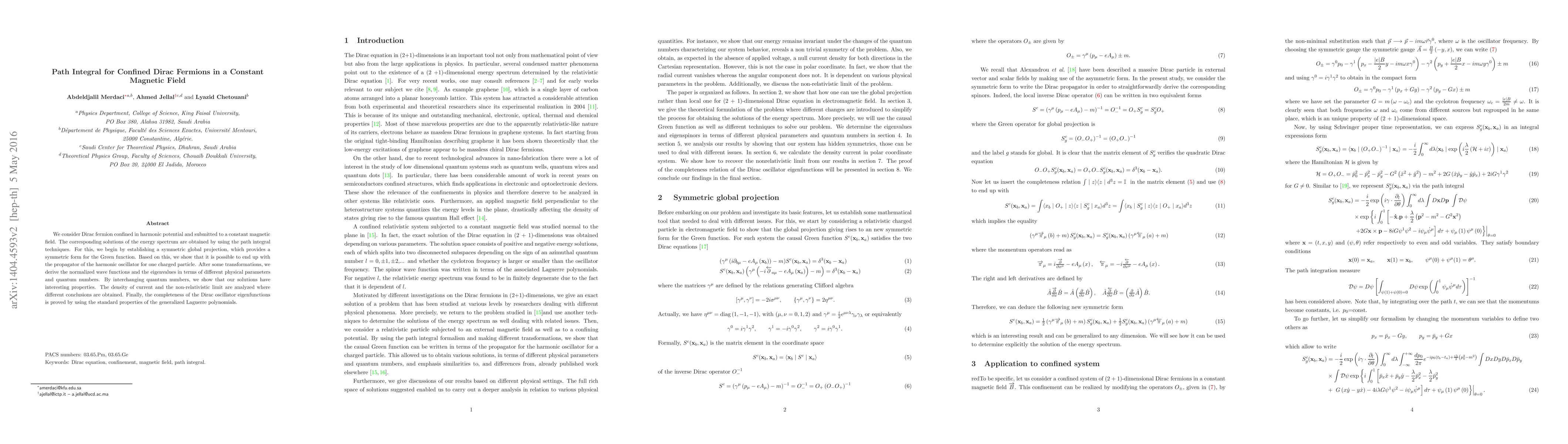 This paper uses path integral techniques to study Dirac fermions confined in a harmonic potential under a constant magnetic field, deriving normalized wave functions and eigenvalues. The study reveals interesting properties upon quantum number interchange and analyzes current density and non-relativistic limits.