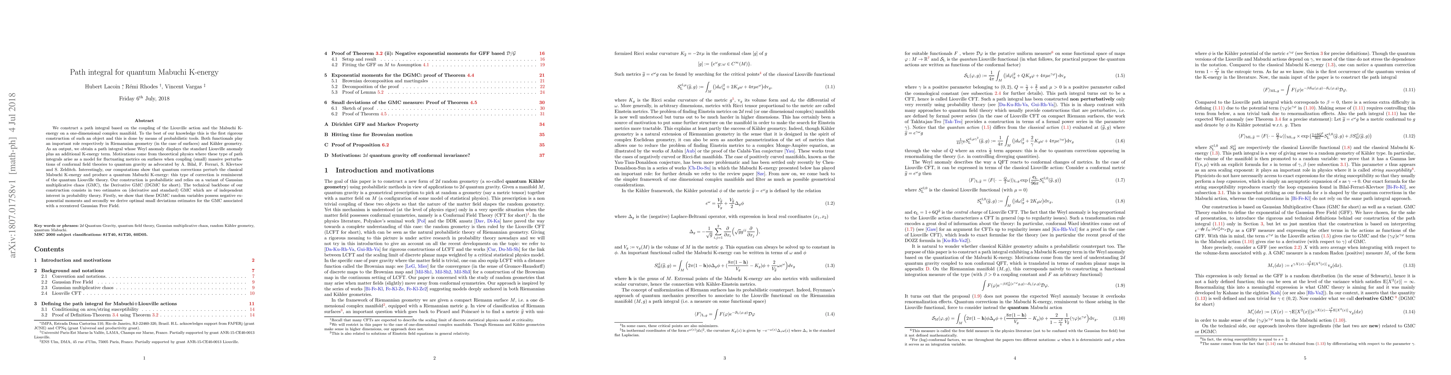 We construct a path integral based on the coupling of the Liouville action and the Mabuchi K-energy on a one-dimensional complex manifold. To the best of our knowledge this is the first rigorous construction of such an object and this is done by means of probabilistic tools. Both functionals play an important role respectively in Riemannian geometry (in the case of surfaces) and K\"ahler geometry. As an output, we obtain a path integral whose Weyl anomaly displays the standard Liouville anomaly plus an additional K-energy term. Motivations come from theoretical physics where these type of path integrals arise as a model for fluctuating metrics on surfaces when coupling (small) massive perturbations of conformal field theories to quantum gravity as advocated by A. Bilal, F. Ferrari, S. Klevtsov and S. Zelditch. Interestingly, our computations show that quantum corrections perturb the classical Mabuchi K-energy and produce a quantum Mabuchi K-energy: this type of correction is reminiscent of the quantum Liouville theory. Our construction is probabilistic and relies on a variant of Gaussian multiplicative chaos (GMC), the Derivative GMC (DGMC for short). The technical backbone of our construction consists in two estimates on (derivative and standard) GMC which are of independent interest in probability theory. Firstly, we show that these DGMC random variables possess negative exponential moments and secondly we derive optimal small deviations estimates for the GMC associated with a recentered Gaussian Free Field.