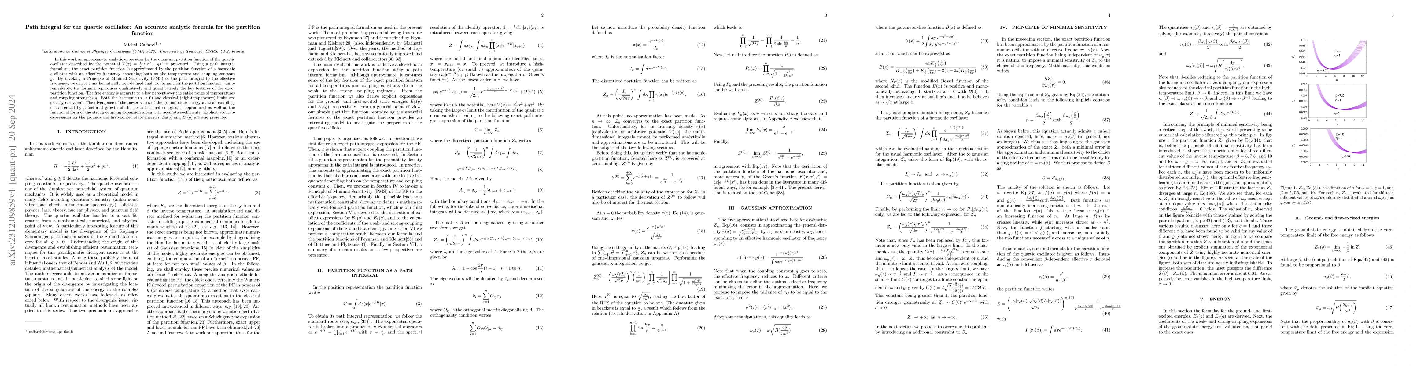 The paper derives a simple analytic expression for the partition function of the quartic oscillator using the path-integral method, which is accurate across various temperature and coupling regimes, and compares it to existing approximations. The derived expression also accurately captures the divergence of perturbational energies and the strong-coupling expansion.