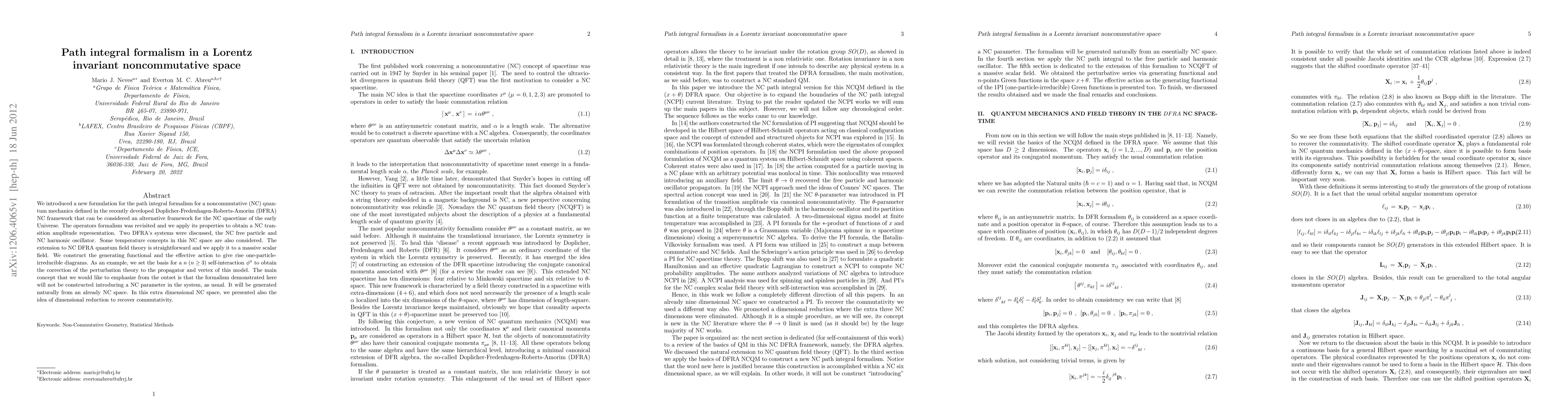 We introduced a new formulation for the path integral formalism for a noncommutative (NC) quantum mechanics defined in the recently developed Doplicher-Fredenhagen-Roberts-Amorim (DFRA) NC framework that can be considered an alternative framework for the NC spacetime of the early Universe. The operators formalism was revisited and we apply its properties to obtain a NC transition amplitude representation. Two DFRA's systems were discussed, the NC free particle and NC harmonic oscillator. Some temperature concepts in this NC space are also considered. The extension to NC DFRA quantum field theory is straightforward and we apply it to a massive scalar field. We construct the generating functional and the effective action to give rise one-particle-irreducible diagrams. As an example, we set the basis for a $n\;(n\geq 3)$ self-interaction $\phi^{n}$ to obtain the correction of the perturbation theory to the propagator and vertex of this model. The main concept that we would like to emphasize from the outset is that the formalism demonstrated here will not be constructed introducing a NC parameter in the system, as usual. It will be generated naturally from an already NC space. In this extra dimensional NC space, we presented also the idea of dimensional reduction to recover commutativity.