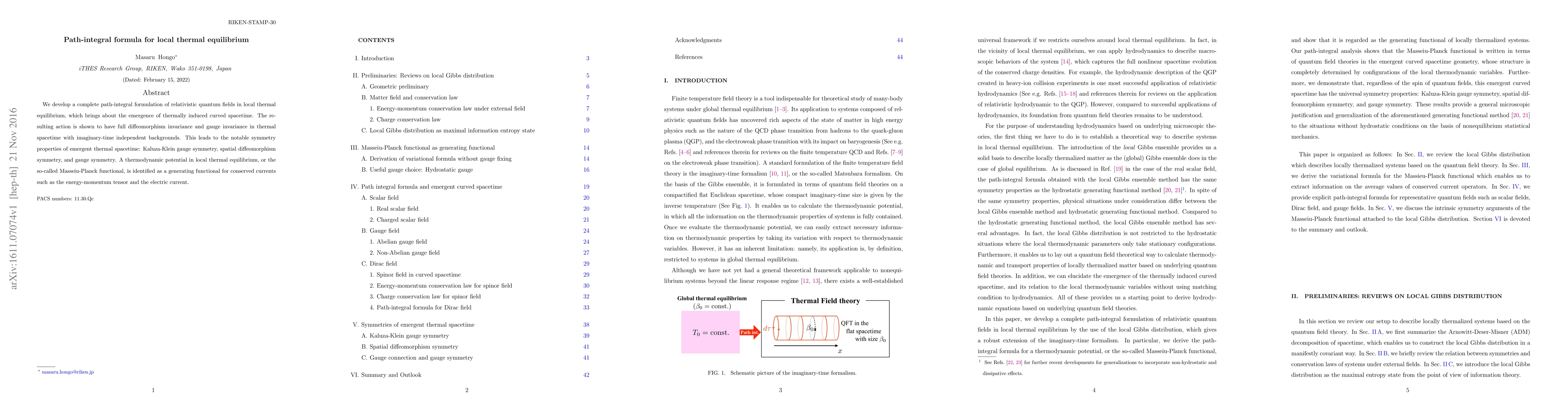 The paper develops a path-integral formulation for relativistic quantum fields in local thermal equilibrium, revealing thermally induced curved spacetime with diffeomorphism and gauge invariance. The emergent thermal spacetime exhibits Kaluza-Klein gauge symmetry, spatial diffeomorphism symmetry, and gauge symmetry, with a thermodynamic potential identified as a functional for conserved currents.