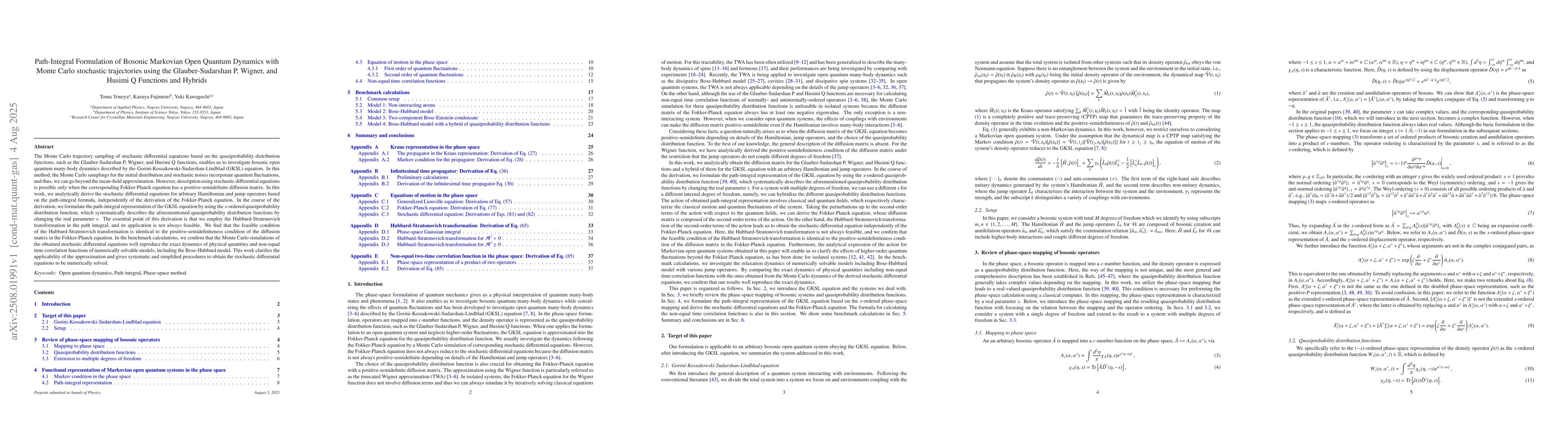 The Monte Carlo (MC) trajectory sampling of stochastic differential equations (SDEs) based on the quasiprobabilities, such as the Glauber-Sudarshan P, Wigner, and Husimi Q functions, enables us to investigate bosonic open quantum many-body dynamics described by the Gorini-Kossakowski-Sudarshan-Lindblad (GKSL) equation. In this method, the MC samplings for the initial distribution and stochastic noises incorporate quantum fluctuations, and thus, we can go beyond the mean-field approximation. However, description using SDEs is possible only when the corresponding Fokker-Planck equation has a positive-semidefinite diffusion matrix. In this work, we analytically derive the SDEs for arbitrary Hamiltonian and jump operators based on the path-integral formula, independently of the derivation of the Fokker-Planck equation (FPE). In the course of the derivation, we formulate the path-integral representation of the GKSL equation by using the $s$-ordered quasiprobability, which systematically describes the aforementioned quasiprobabilities by changing the real parameter $s$. The essential point of this derivation is that we employ the Hubbard-Stratonovich (HS) transformation in the path integral, and its application is not always feasible. We find that the feasible condition of the HS transformation is identical to the positive-semidefiniteness condition of the diffusion matrix in the FPE. In the benchmark calculations, we confirm that the MC simulations of the obtained SDEs well reproduce the exact dynamics of physical quantities and non-equal time correlation functions of numerically solvable models, including the Bose-Hubbard model. This work clarifies the applicability of the approximation and gives systematic and simplified procedures to obtain the SDEs to be numerically solved.