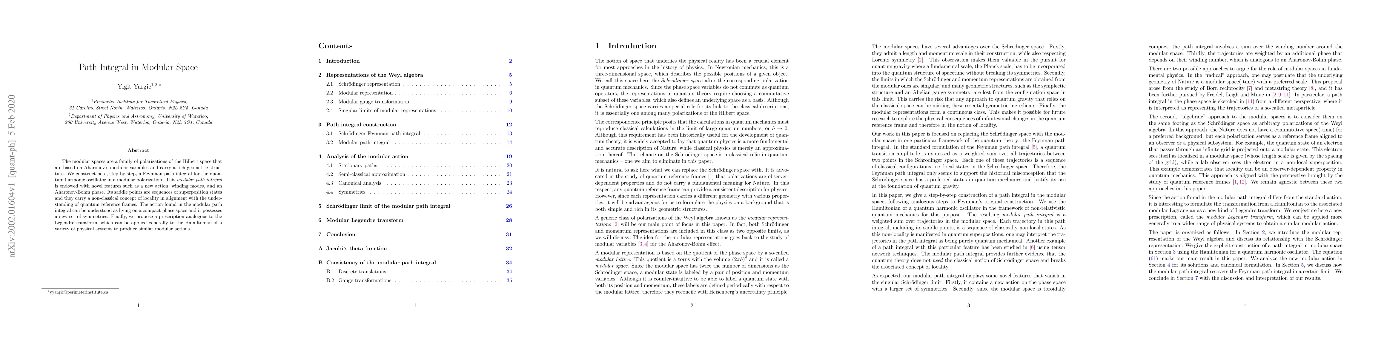 This paper constructs a Feynman path integral for the quantum harmonic oscillator in modular polarization, revealing novel features like a new action, winding modes, and Aharonov-Bohm phase, and proposes a general prescription for producing similar modular actions. The modular path integral exhibits a non-classical concept of locality and new symmetries.