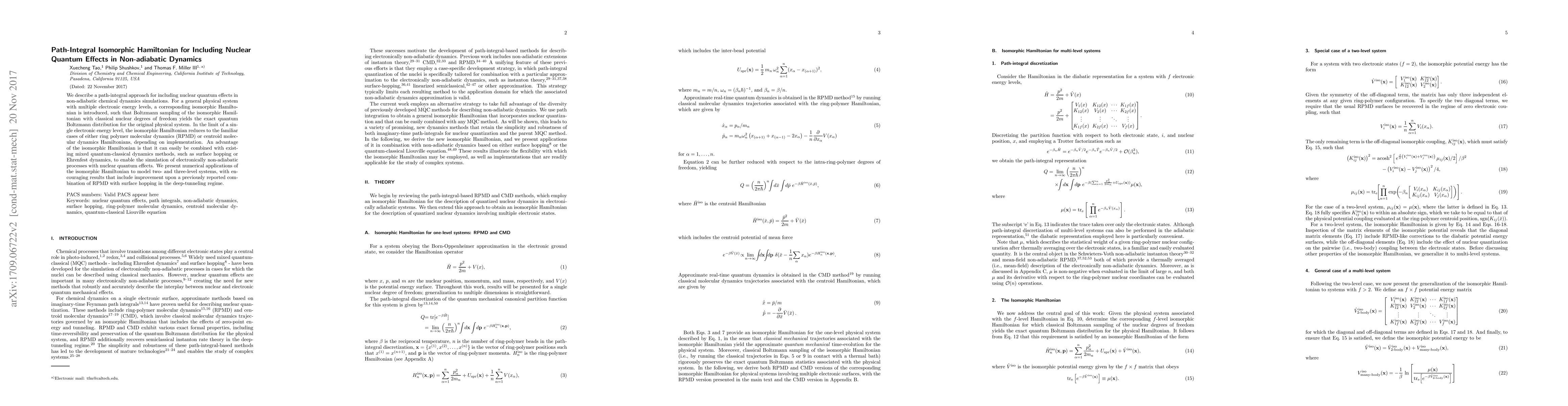 This paper introduces a path-integral isomorphic Hamiltonian to incorporate nuclear quantum effects in non-adiabatic chemical dynamics simulations, enabling accurate Boltzmann sampling and facilitating the combination with mixed quantum-classical dynamics methods. The method shows promising results in modeling multi-level systems, particularly in the deep-tunneling regime.
