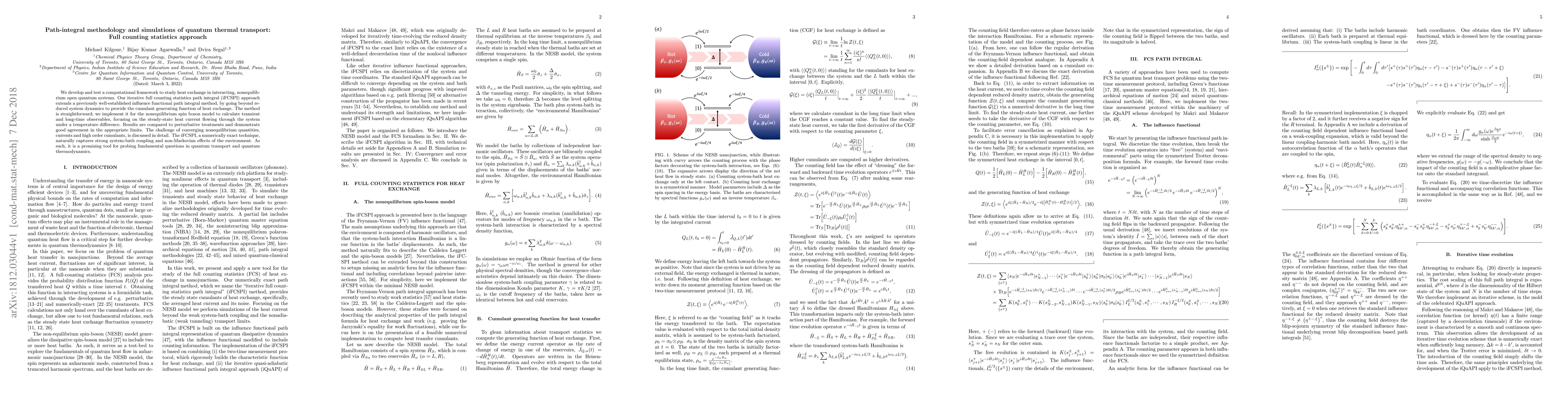 This paper introduces an iterative full counting statistics path integral method (iFCSPI) to study quantum thermal transport in nonequilibrium open quantum systems. The method provides a numerically exact approach to calculate heat exchange and steady-state heat currents, capturing strong coupling and non-Markovian effects, and shows good agreement with perturbative treatments.
