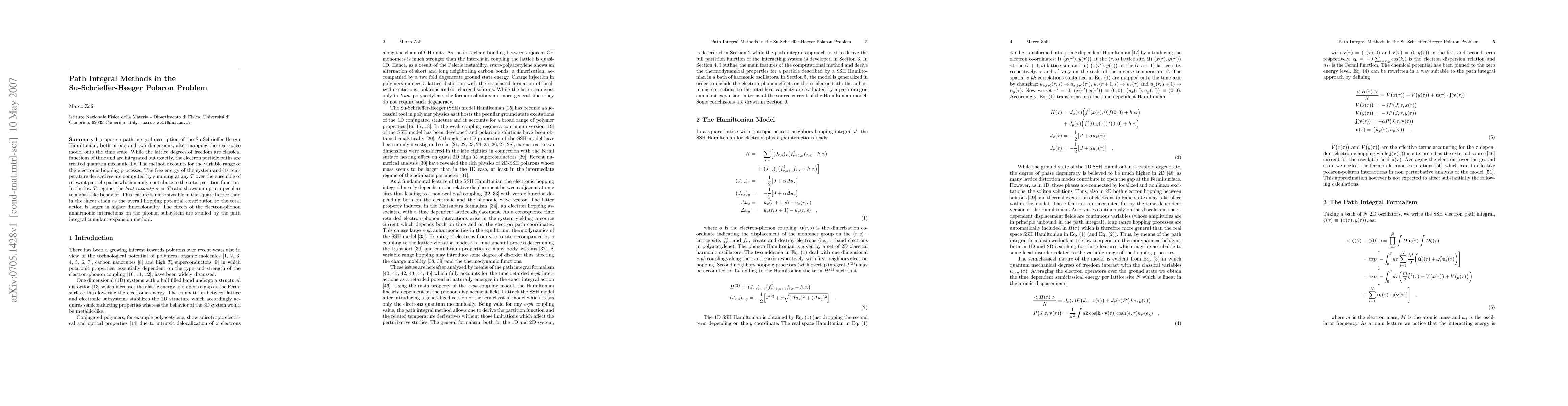 I propose a path integral description of the Su-Schrieffer-Heeger Hamiltonian, both in one and two dimensions, after mapping the real space model onto the time scale. While the lattice degrees of freedom are classical functions of time and are integrated out exactly, the electron particle paths are treated quantum mechanically. The method accounts for the variable range of the electronic hopping processes. The free energy of the system and its temperature derivatives are computed by summing at any $T$ over the ensemble of relevant particle paths which mainly contribute to the total partition function. In the low $T$ regime, the {\it heat capacity over T} ratio shows un upturn peculiar to a glass-like behavior. This feature is more sizeable in the square lattice than in the linear chain as the overall hopping potential contribution to the total action is larger in higher dimensionality. The effects of the electron-phonon anharmonic interactions on the phonon subsystem are studied by the path integral cumulant expansion method.