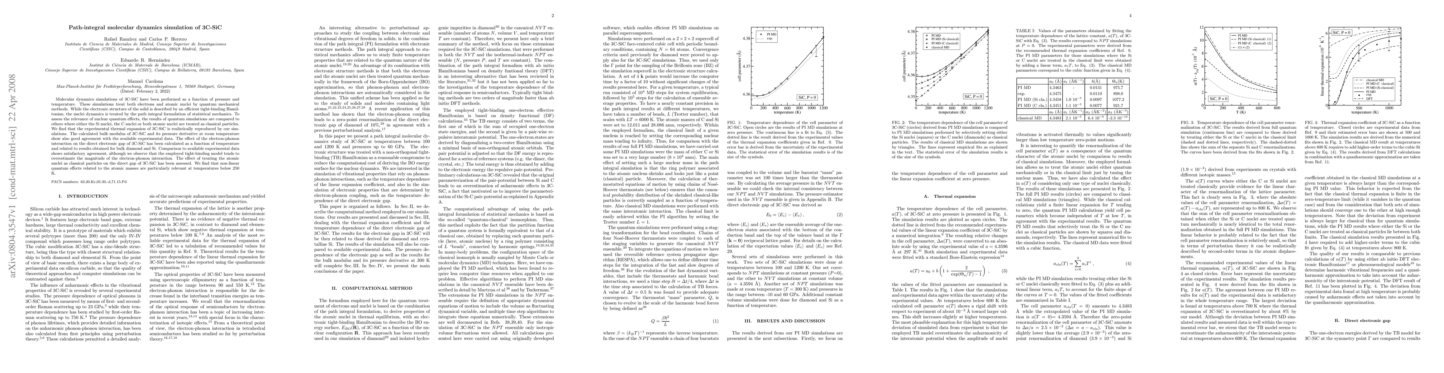 This paper presents path-integral molecular dynamics simulations of 3C-SiC under varying pressure and temperature, comparing quantum mechanical treatments of electrons and nuclei to classical treatments. The study finds good agreement between simulation results and experimental data for thermal expansion and bulk modulus, highlighting the importance of nuclear quantum effects, especially at low temperatures.