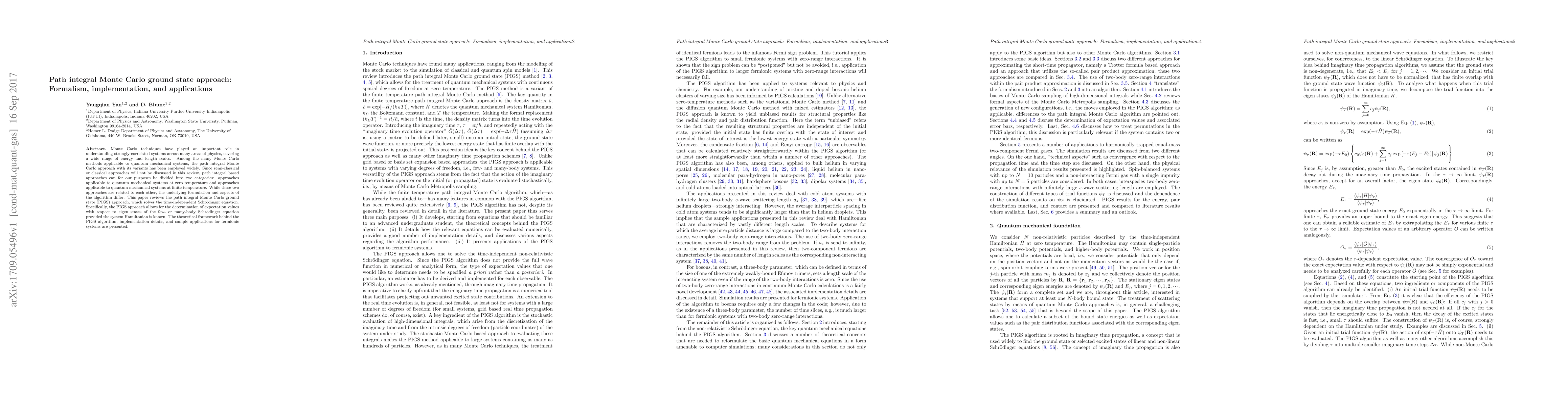This paper reviews the path integral Monte Carlo ground state (PIGS) approach, which solves the time-independent Schrödinger equation to determine expectation values for quantum systems. It covers the theoretical framework, implementation details, and sample applications for various quantum systems.