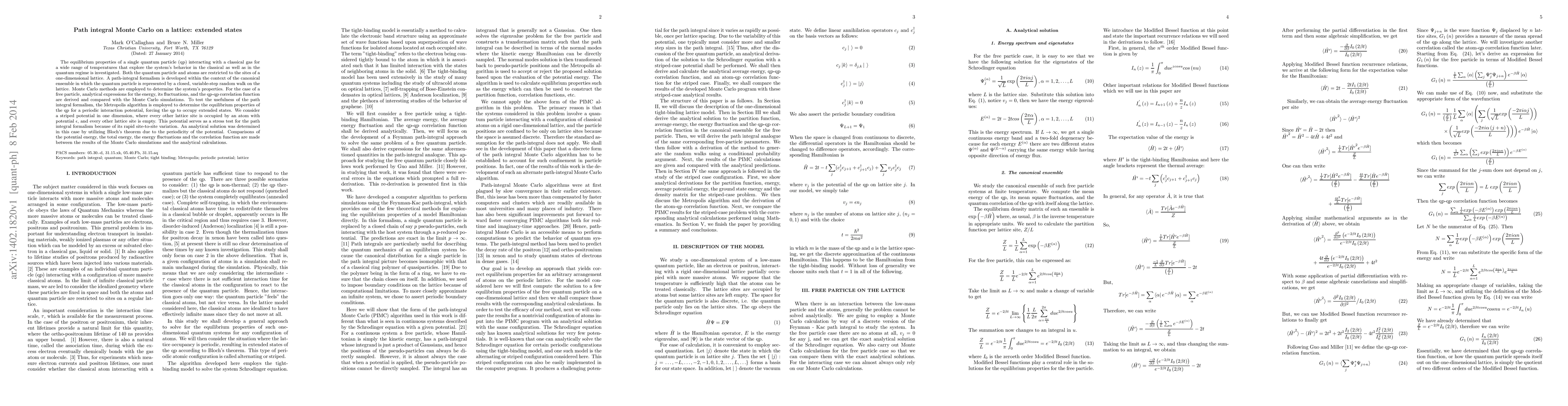 The equilibrium properties of a single quantum particle (qp) interacting with a classical gas for a wide range of temperatures that explore the system's behavior in the classical as well as in the quantum regime is investigated. Both the quantum particle and atoms are restricted to the sites of a one-dimensional lattice. A path-integral formalism is developed within the context of the canonical ensemble in which the quantum particle is represented by a closed, variable-step random walk on the lattice. Monte Carlo methods are employed to determine the system's properties. For the case of a free particle, analytical expressions for the energy, its fluctuations, and the qp-qp correlation function are derived and compared with the Monte Carlo simulations. To test the usefulness of the path integral formalism, the Metropolis algorithm is employed to determine the equilibrium properties of the qp for a periodic interaction potential, forcing the qp to occupy extended states. We consider a striped potential in one dimension, where every other lattice site is occupied by an atom with potential $\epsilon$, and every other lattice site is empty. This potential serves as a stress test for the path integral formalism because of its rapid site-to-site variation. An analytical solution was determined in this case by utilizing Bloch's theorem due to the periodicity of the potential. Comparisons of the potential energy, the total energy, the energy fluctuations and the correlation function are made between the results of the Monte Carlo simulations and the analytical calculations.