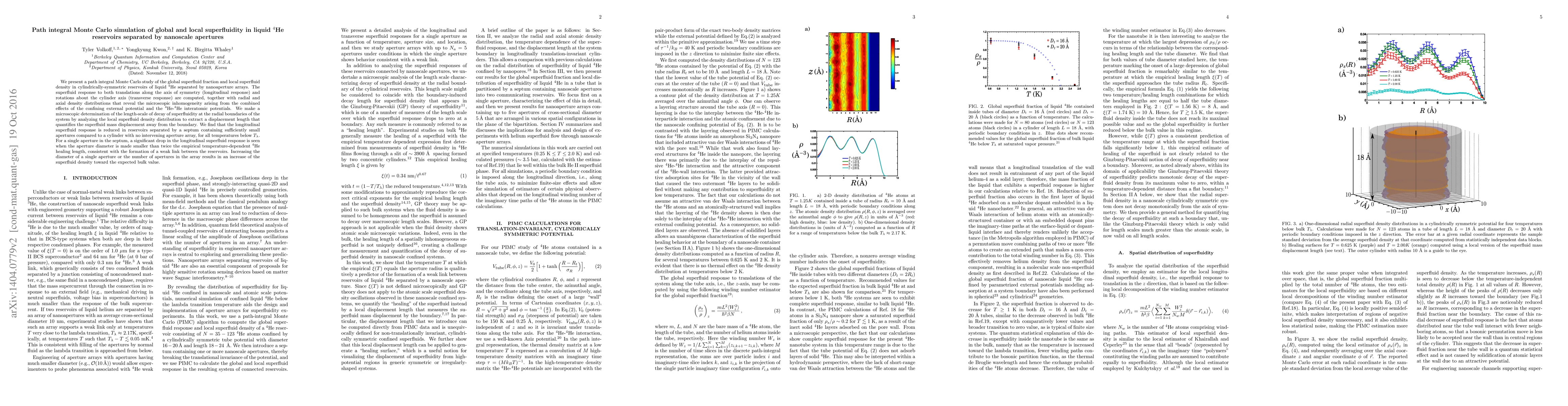 We present a path integral Monte Carlo study of the global superfluid fraction and local superfluid density in cylindrically-symmetric reservoirs of liquid $^{4}$He separated by nanoaperture arrays. The superfluid response to both translations along the axis of symmetry (longitudinal response) and rotations about the cylinder axis (transverse response) are computed, together with radial and axial density distributions that reveal the microscopic inhomogeneity arising from the combined effects of the confining external potential and the $^4$He-$^4$He interatomic potentials. We make a microscopic determination of the length-scale of decay of superfluidity at the radial boundaries of the system by analyzing the local superfluid density distribution to extract a displacement length that quantifies the superfluid mass displacement away from the boundary. We find that the longitudinal superfluid response is reduced in reservoirs separated by a septum containing sufficiently small apertures compared to a cylinder with no intervening aperture array, for all temperatures below $T_{\lambda}$. For a single aperture in the septum, a significant drop in the longitudinal superfluid response is seen when the aperture diameter is made smaller than twice the empirical temperature-dependent $^4$He healing length, consistent with the formation of a weak link between the reservoirs. Increasing the diameter of a single aperture or the number of apertures in the array results in an increase of the superfluid density toward the expected bulk value.