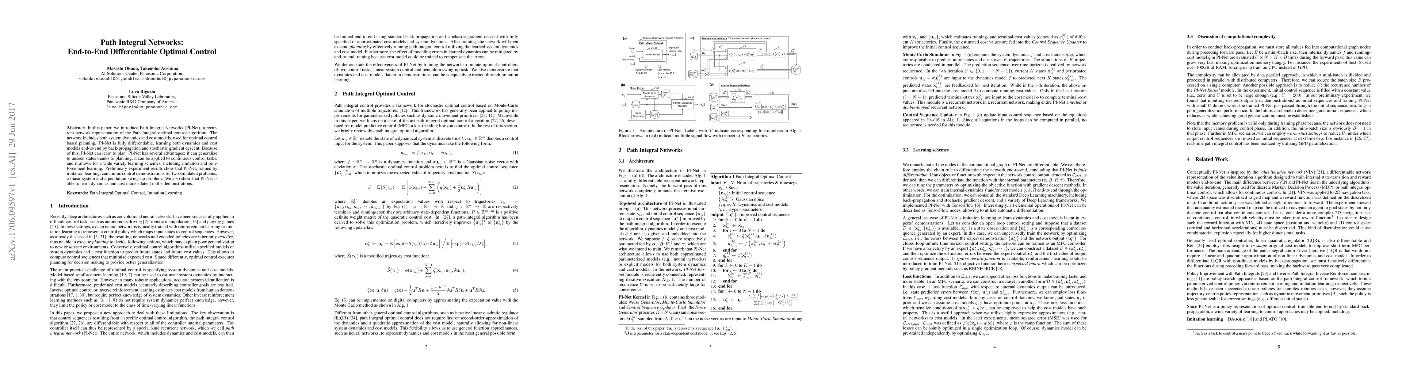 This paper introduces Path Integral Networks (PI-Net), a differentiable recurrent network that represents the Path Integral optimal control algorithm for end-to-end planning and control. PI-Net learns system dynamics and cost models through back-propagation, demonstrating generalization and applicability to continuous control tasks.