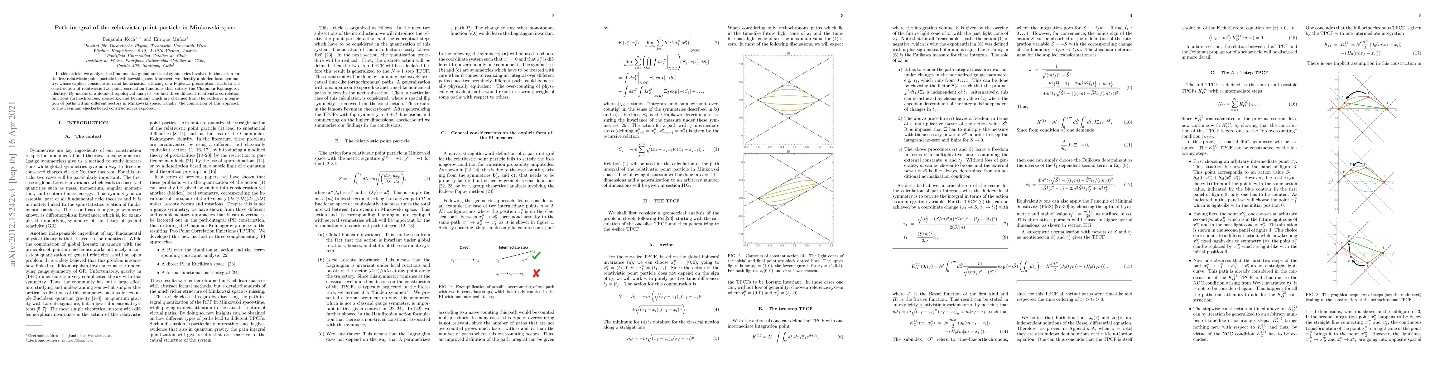 In this article, we analyze the fundamental global and local symmetries involved in the action for the free relativistic point particle. Moreover, we identify a hidden local symmetry, whose explicit consideration and factorization utilizing of a Fujikawa prescription, leads to the construction of relativistic propagators that satisfy the Chapman-Kolmogorov identity. By means of a detailed topological analysis, we find three different relativistic propagators (orthochronous, space-like, and Feynman) which are obtained from the exclusive integration of paths within different sectors in Minkowski space. Finally, the connection of this approach to the Feynman checkerboard construction is explored.