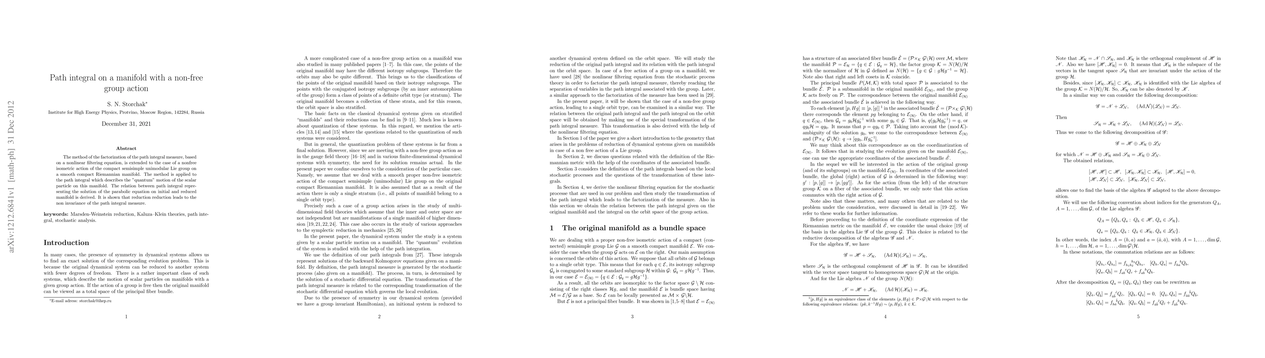 The method of the factorization of the path integral measure, based on a nonlinear filtering equation, is extended to the case of a nonfree isometric action of the compact semisimple unimodular Lie group on a smooth compact Riemannian manifold. The method is applied to the path integral which describes the "quantum" motion of the scalar particle on this manifold. The relation between path integral representing the solution of the parabolic equation on initial and reduced manifold is derived. It is shown that reduction reduction leads to the non invariance of the path integral measure.