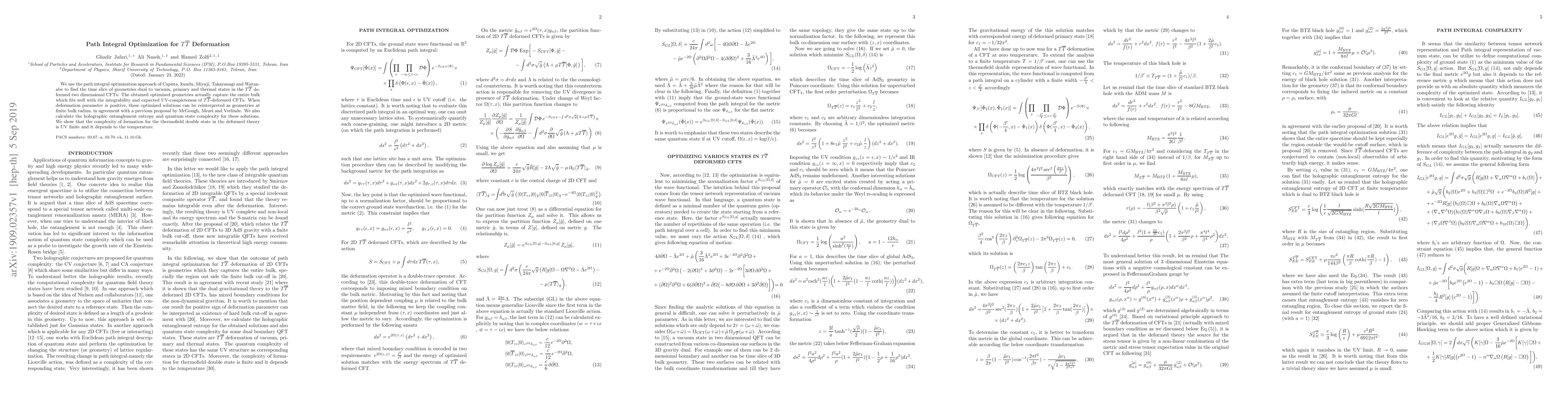 This paper employs path integral optimization to explore the geometries dual to vacuum, primary, and thermal states in $T\bar{T}$-deformed two-dimensional CFTs, revealing optimized bulk geometries that align with the theory's integrability and UV-completeness. The study also calculates holographic entanglement entropy and quantum state complexity, demonstrating UV finite complexity dependent on temperature.