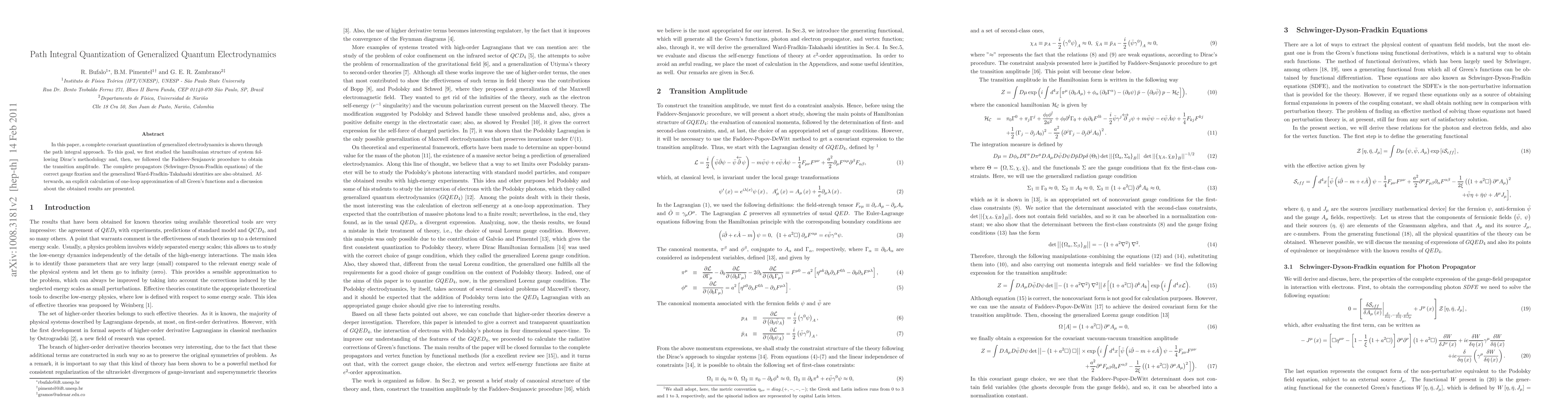 In this paper, a complete covariant quantization of generalized electrodynamics is shown through the path integral approach. To this goal, we first studied the hamiltonian structure of system following Dirac's methodology and, then, we followed the Faddeev-Senjanovic procedure to obtain the transition amplitude. The complete propagators (Schwinger-Dyson-Fradkin equations) of the correct gauge fixation and the generalized Ward-Fradkin-Takahashi identities are also obtained. Afterwards, an explicit calculation of one-loop approximation of all Green's functions and a discussion about the obtained results are presented.