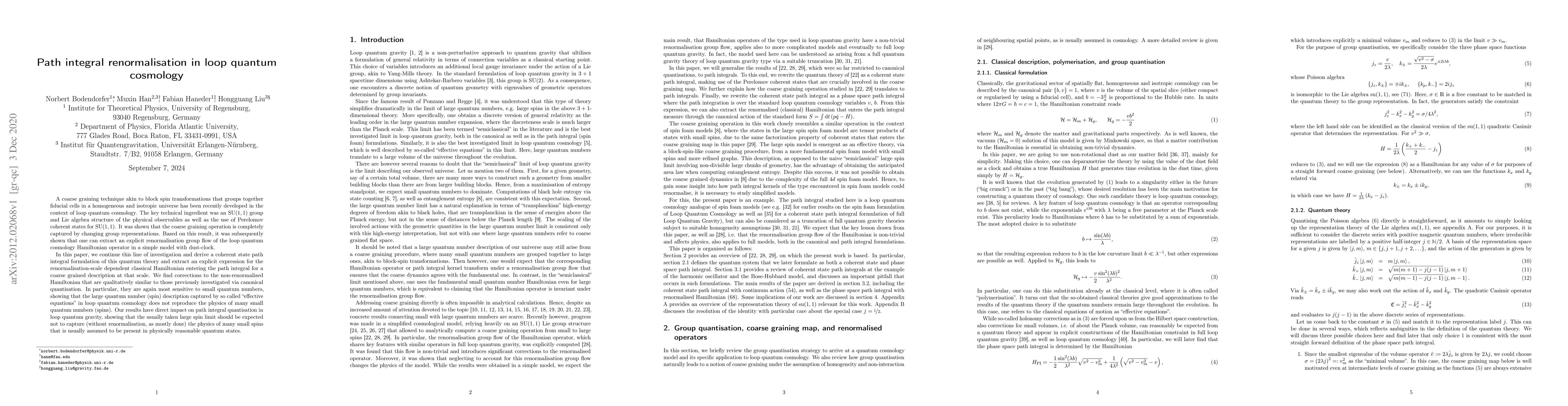 A coarse graining technique akin to block spin transformations that groups together fiducial cells in a homogeneous and isotropic universe has been recently developed in the context of loop quantum cosmology. The key technical ingredient was an SU(1, 1) group and Lie algebra structure of the physical observables as well as the use of Perelomov coherent states for SU(1, 1). It was shown that the coarse graining operation is completely captured by changing group representations. Based on this result, it was subsequently shown that one can extract an explicit renormalisation group flow of the loop quantum cosmology Hamiltonian operator in a simple model with dust-clock. In this paper, we continue this line of investigation and derive a coherent state path integral formulation of this quantum theory and extract an explicit expression for the renormalisation-scale dependent classical Hamiltonian entering the path integral for a coarse grained description at that scale. We find corrections to the non-renormalised Hamiltonian that are qualitatively similar to those previously investigated via canonical quantisation. In particular, they are again most sensitive to small quantum numbers, showing that the large quantum number (spin) description captured by so called "effective equations" in loop quantum cosmology does not reproduce the physics of many small quantum numbers (spins). Our results have direct impact on path integral quantisation in loop quantum gravity, showing that the usually taken large spin limit should be expected not to capture (without renormalisation, as mostly done) the physics of many small spins that is usually assumed to be present in physically reasonable quantum states.
