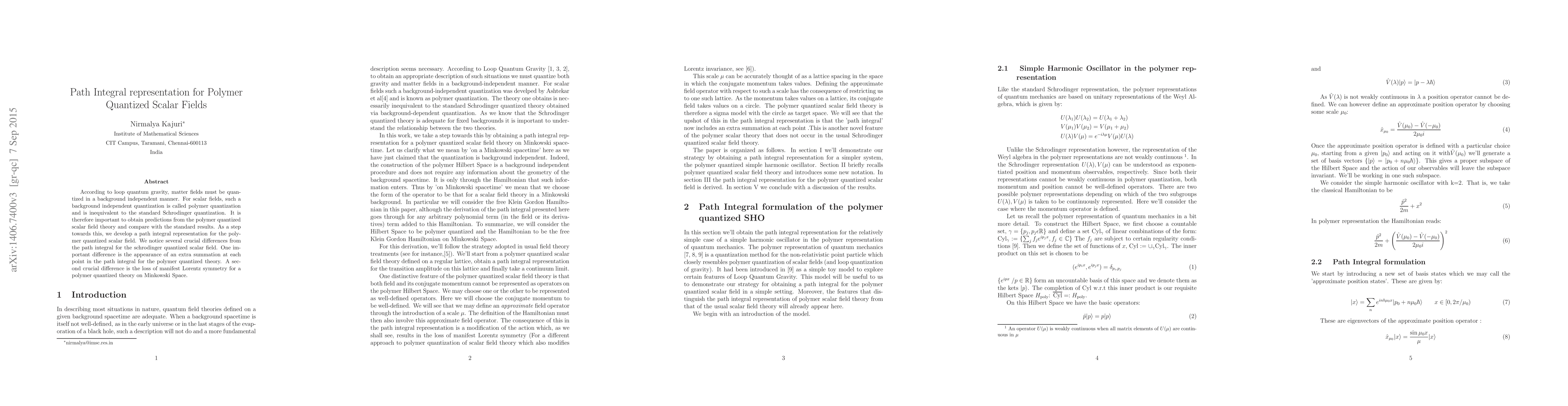 This paper develops a path integral representation for polymer quantized scalar fields in loop quantum gravity, highlighting differences from the standard Schrödinger quantization, including an extra summation and loss of Lorentz symmetry.