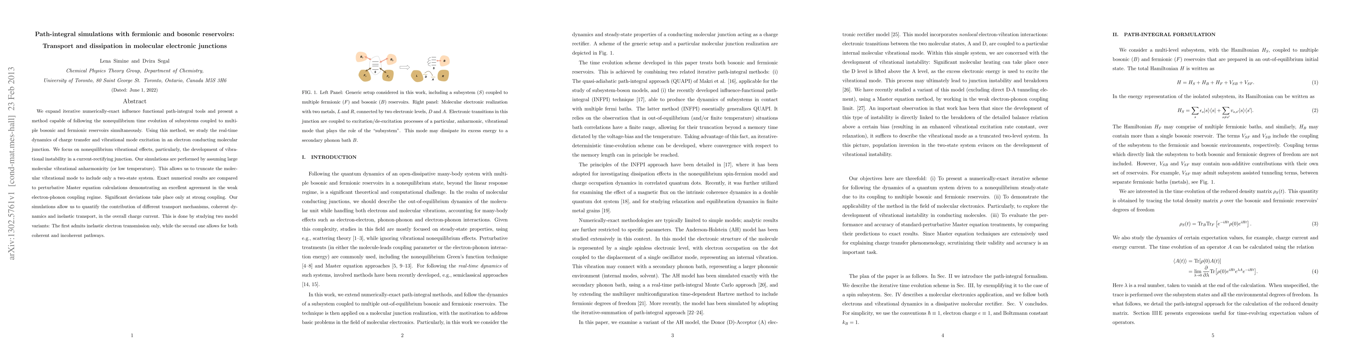 Researchers developed a method to study molecular electronic junctions using path-integral simulations with fermionic and bosonic reservoirs, revealing new insights into charge transfer and vibrational mode excitation.