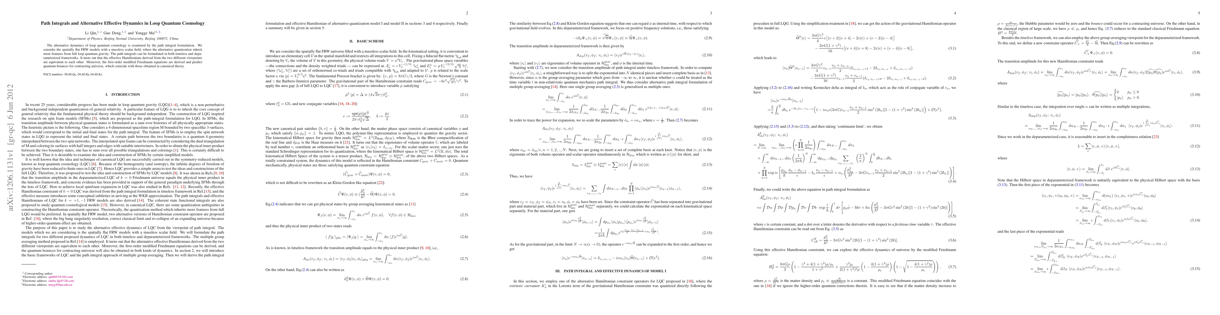 This paper explores alternative dynamics in loop quantum cosmology using path integral formulation, demonstrating equivalence of effective Hamiltonians derived from timeless and deparameterized frameworks. It also derives first-order modified Friedmann equations predicting quantum bounces in contracting universes, consistent with canonical theory results.