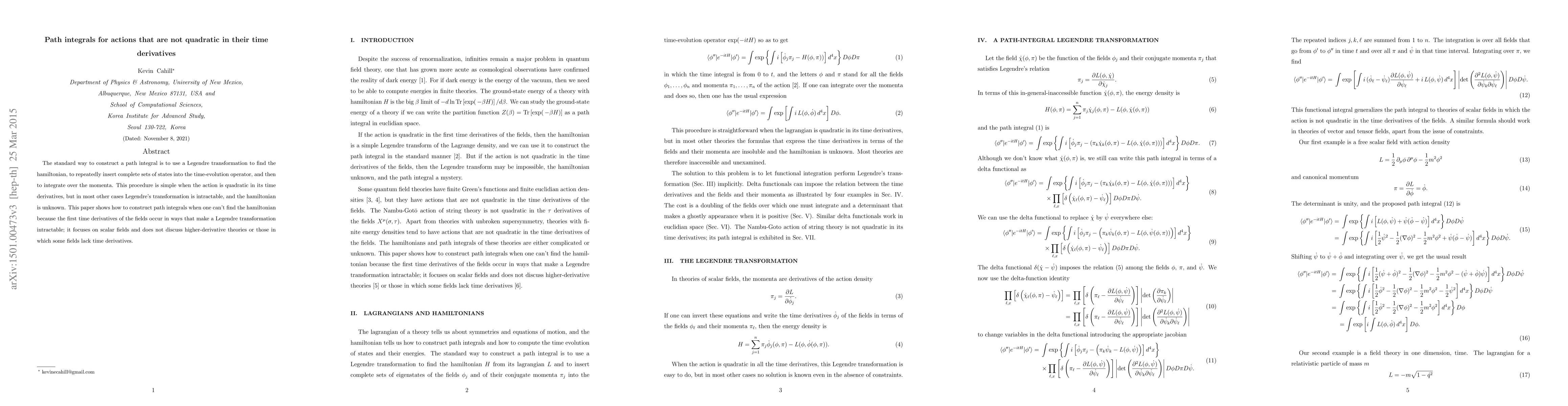 The standard way to construct a path integral is to use a Legendre transformation to find the hamiltonian, to repeatedly insert complete sets of states into the time-evolution operator, and then to integrate over the momenta. This procedure is simple when the action is quadratic in its time derivatives, but in most other cases Legendre's transformation is intractable, and the hamiltonian is unknown. This paper shows how to construct path integrals when one can't find the hamiltonian because the first time derivatives of the fields occur in ways that make a Legendre transformation intractable; it focuses on scalar fields and does not discuss higher-derivative theories or those in which some fields lack time derivatives.